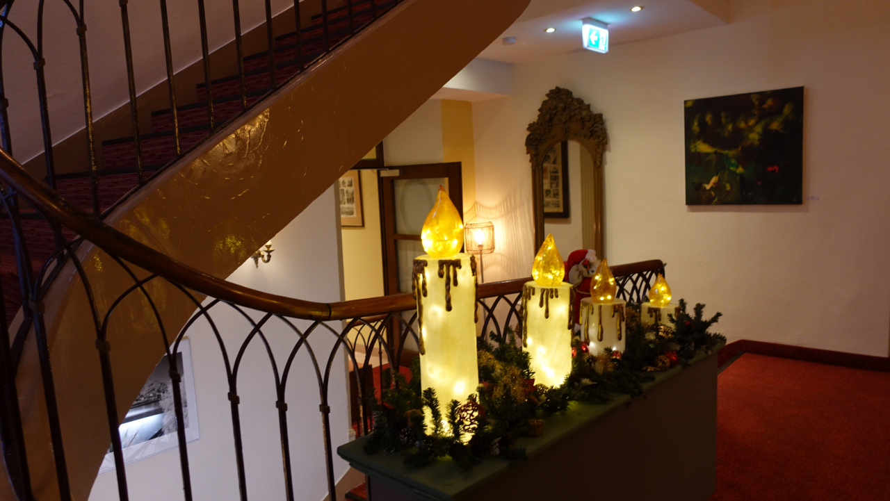 こちらのホテルは、カールテオドール橋のたもとにあります。ピンクの外観で、いかにも伝統を感じる外観で、内部も螺旋階段の手すりにランプがともって、雰囲気抜群のホテルです。このようなホテルなので、若干高かったですが、ハイデルブルグの思い出となるホテルです。フロントも24時間対応でセキュリティーもばっちりです。夜もにぎやかな旧市街を楽しめてよかったです。