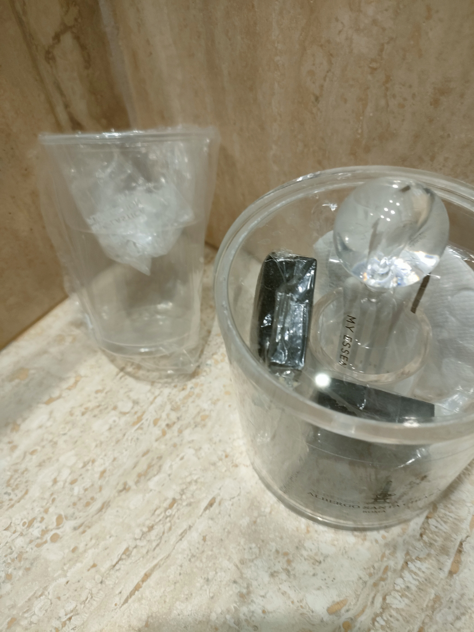 洗面台のコップは個別包装の使い捨てプラスチックで衛生的。(投稿写真4枚目)
