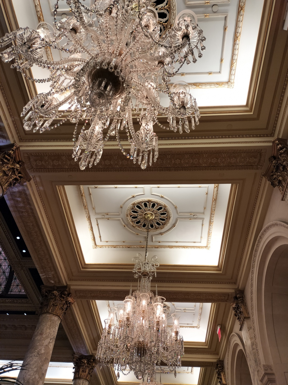 諦めてブロックを回り込むとホテルの横側のドアからなら入れました。地下のトイレは普通、ロビーは廊下の天井まで豪華です。