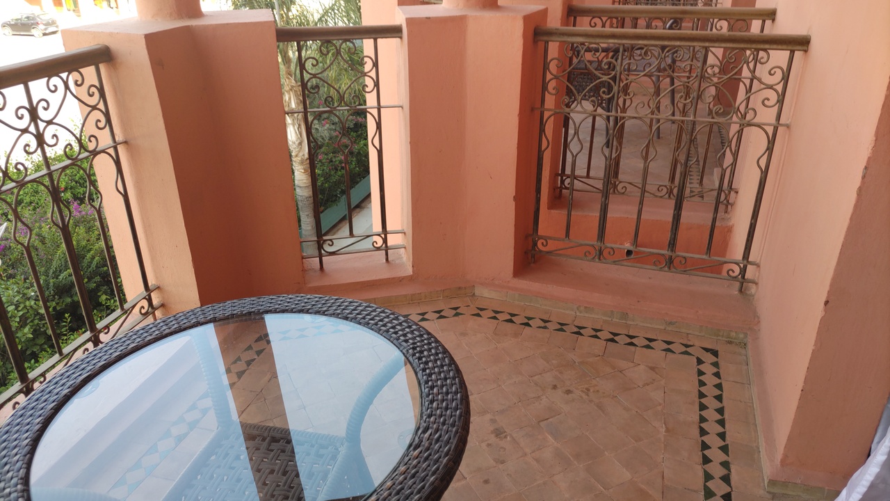 ゛パームプラザホテル゛はマラケシュの郊外に在るホテルで団体ツアーで宿泊しました。5つ星のホテルでフランス風の居心地の良い部屋はベランダが付いてゆったりとできました。近くにカルフールスーパーがありましたのでお土産を買いに行きました。食事は美味しく居心地の良いホテルでした。エントランスや館内にはカサブランカの花々が飾られていました。