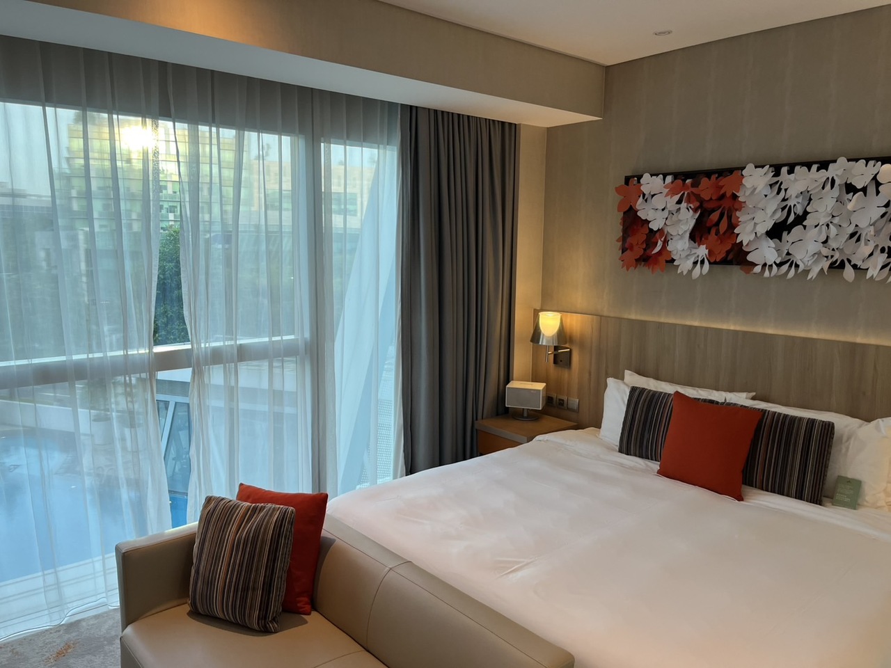 チャンギ空港から一駅のエキスポ駅からモールの中を通って2.3分で着ける便利なホテルです。トランジットのために滞在しました。シンガポールは狭い部屋のホテルが多い中このホテルは大変広く綺麗でキッチンも付いているので食材を買って来て自炊も出来ます。モールが併設されているので食事や買い物も雨でも濡れずに行け、町中に観光に行くにも駅近で大変便利なのでまたシンガポールに行く機会があれば泊まりたいホテルでした。