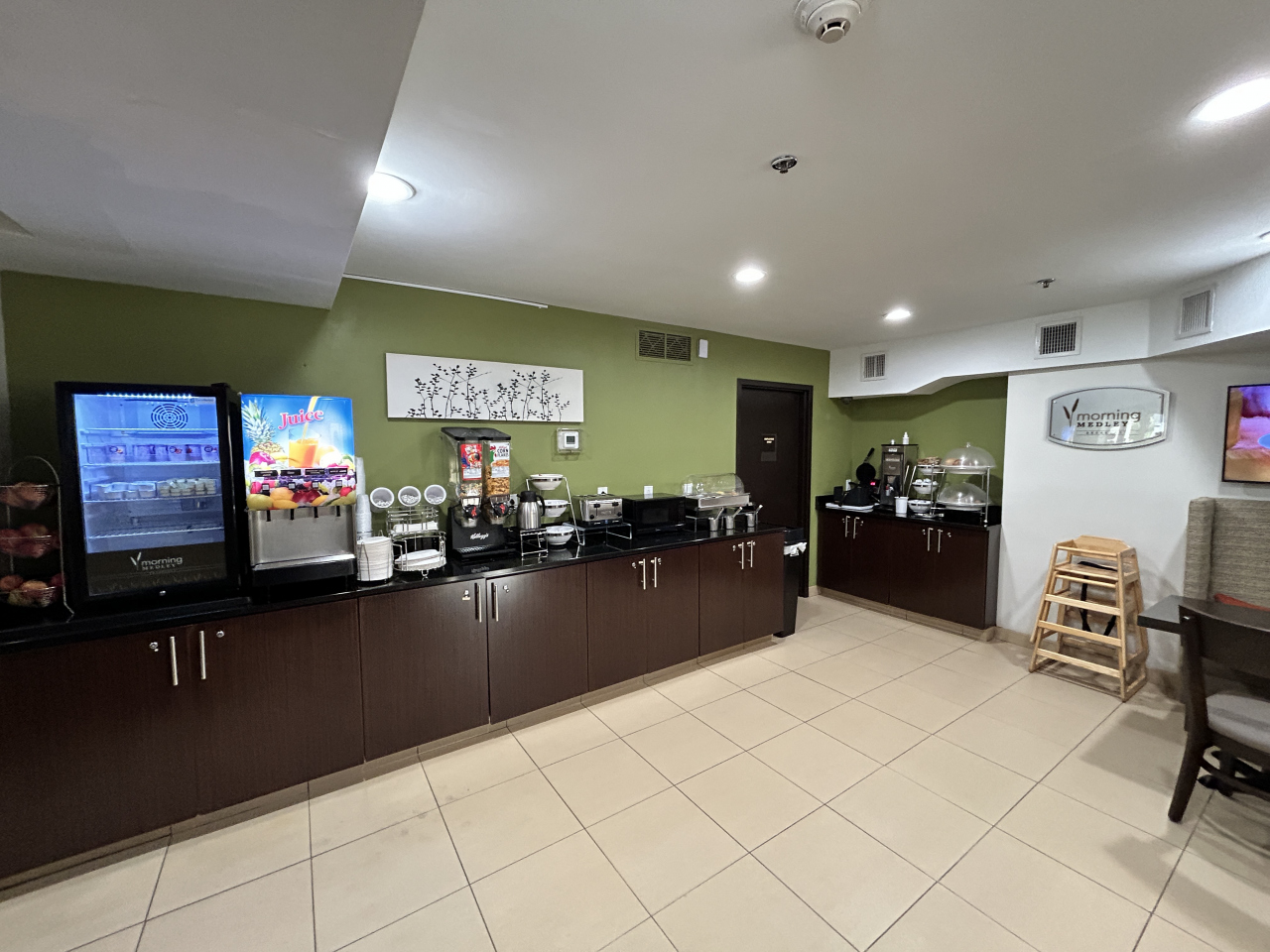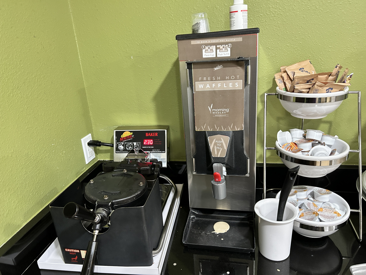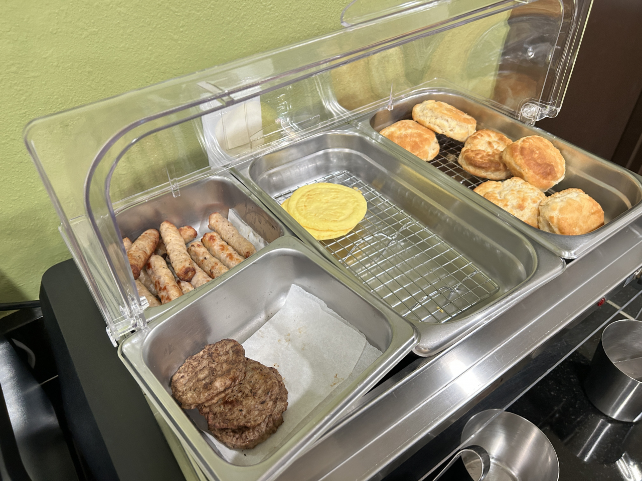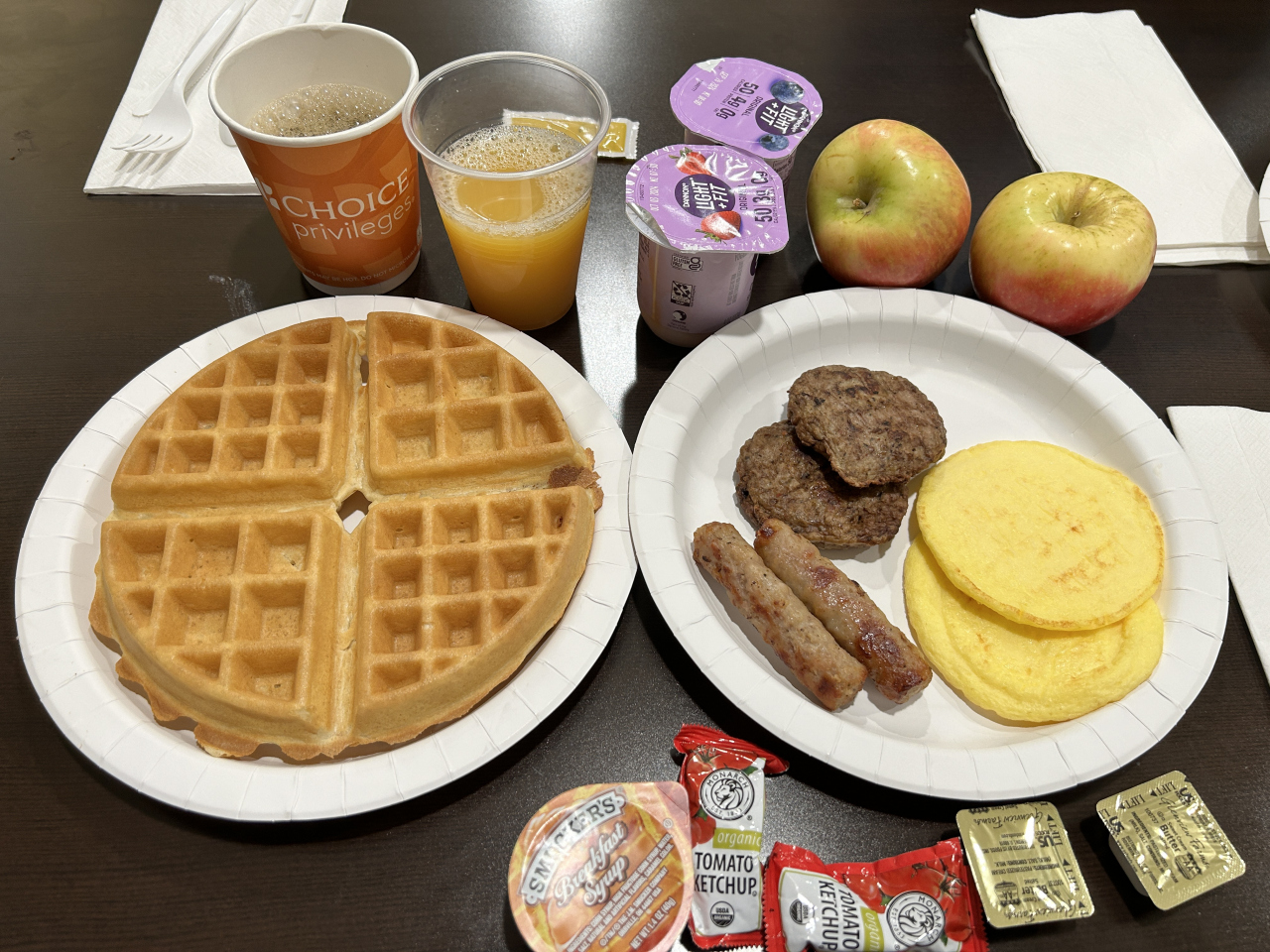 朝食も付いています。安いのでそれなりですが、IHOPとかマックとか行くと割と朝食代がかかりますのでありがたいです。ロードトリップでちょっと泊まるには充分な朝食。自分で焼くワッフルは焼きたて、ソーセージは2種類に果物やヨーグルトまであって宿泊料金の割に充実の無料朝食でした。