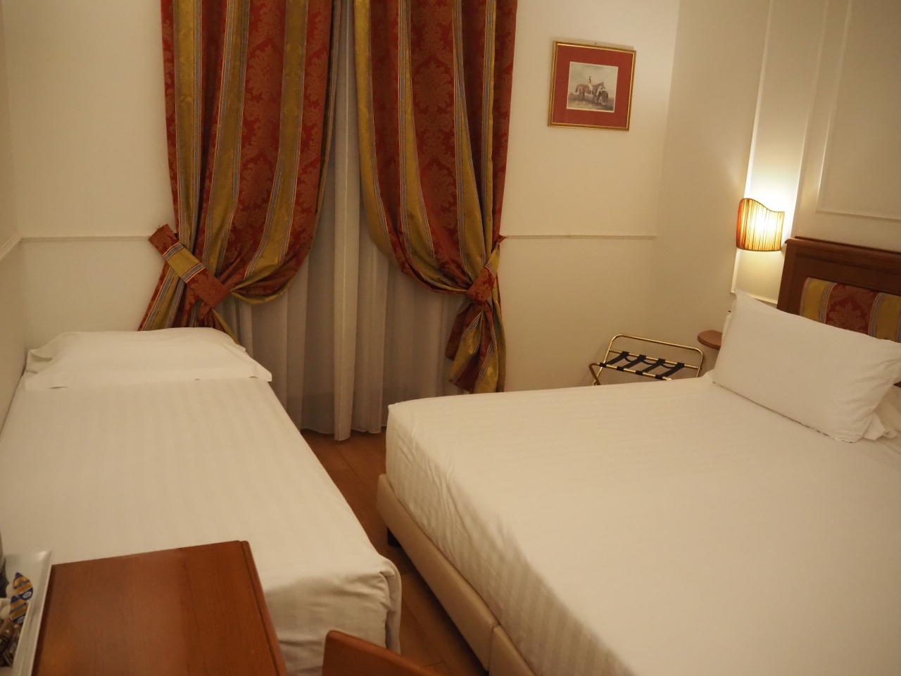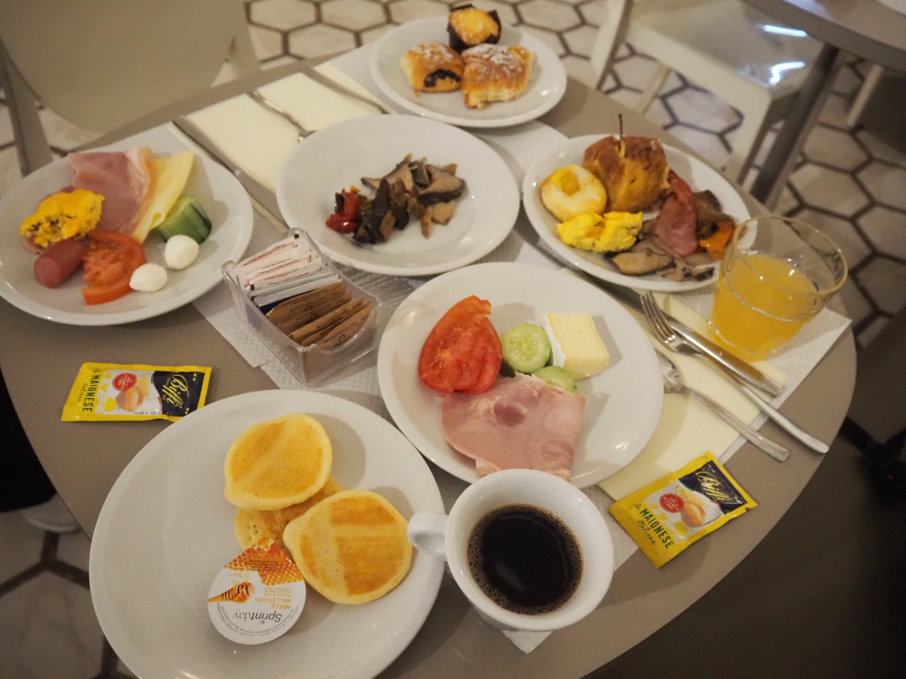 テルミニ駅からA線で2つ目のマンツォーニ駅最寄りの、ホテルミルトンローマ。出発直前に予約。駅の出口の目の前にあるのですが、反対の出口に出てしまったため、駅の周りを15分以上ウロウロする羽目に。グーグルマップがあるにもかかわらず、最寄駅を降りてからホテルを探すのにいつもとても苦労します。ホテルミルトンローマは、古いホテルで、部屋は小さめですが、駅近で、大きな通りの交差点に位置している割には、静か。朝食もおいしく、今回泊まったホテルの中では、コスパ最高でした。イタリアのホテルでは、珍しく、バスタブ付き。ベッドもリクエスト通りに2台(ダブル+シングル)。シングルは補助ベッドみたいに小さかった。朝食のメニューの豊富さには驚きました。特に、パンの種類が多くて、パン好きにとっては、何よりもうれしいです。クロワッサンだけで、6種類もあり、カスタードクリームに、チョコレートクリームに、、、どれも美味でした。ロースハムは肉厚で脂が良く乗っていて、日本ではなかなか食べられない上質なハムでした。残念ながら、期待していたデニッシュやペストリーはありませんでした。これは、その後に泊まった他のホテルの朝食にも共通していたので、イタリアの朝食は、そういうものとあきらめました。