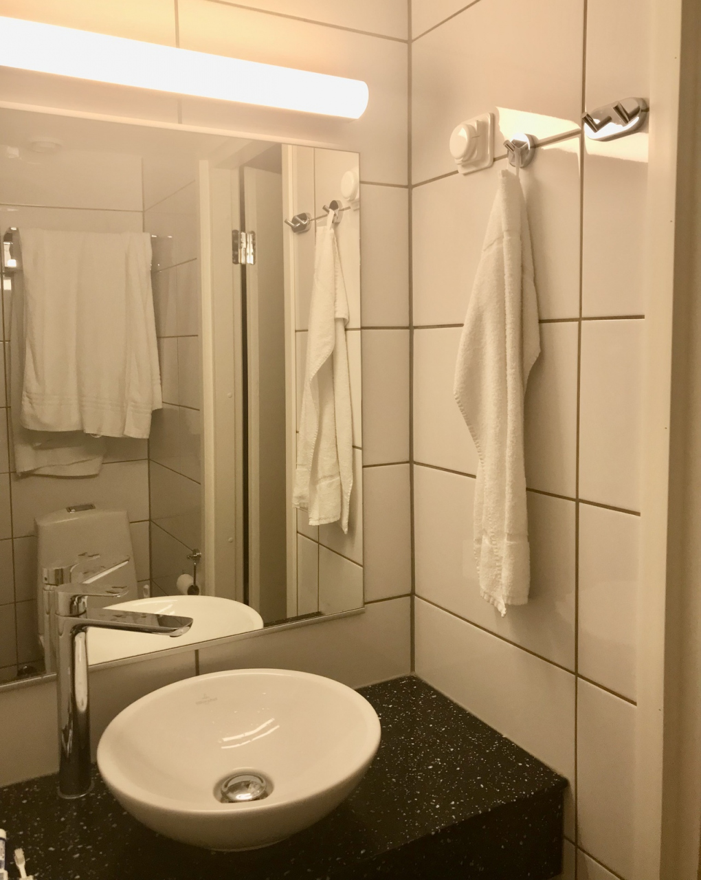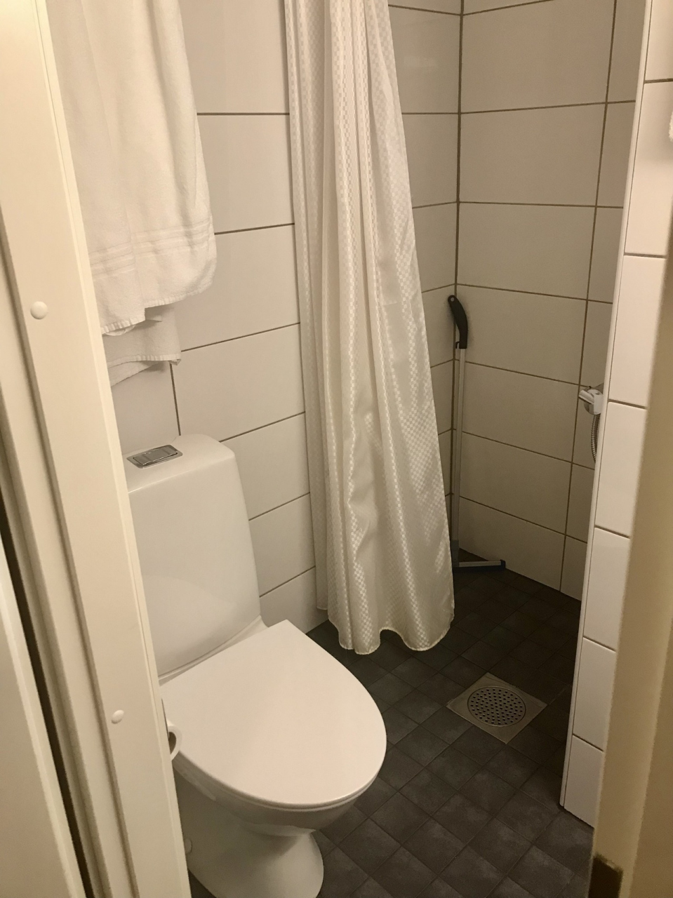 シャワーを浴びるとトイレや洗面台の方の床までビショ濡れになります。備え付けのワイパーで水切りする必要があります。フィンランドはこのタイプのホテルが多いようです。サウナ用に持参していたビーチサンダルが重宝しました。