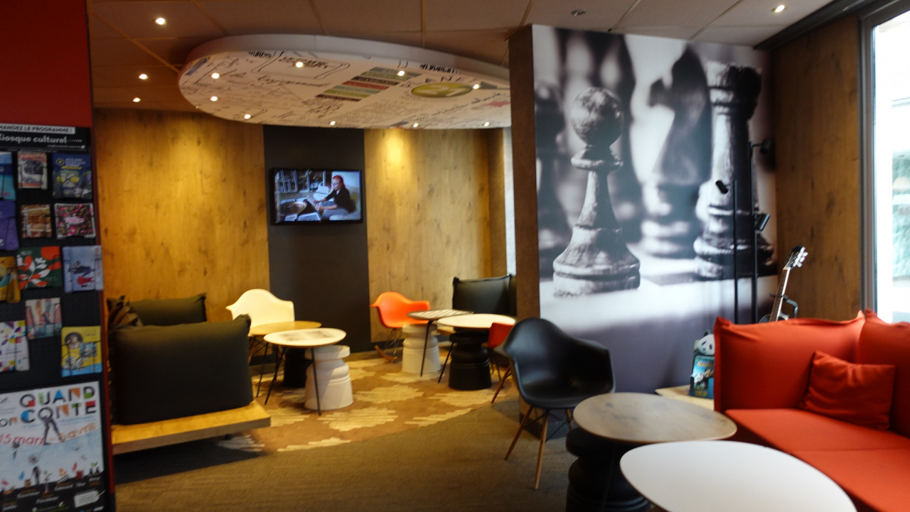 ポワティエには、イビスホテルが2か所あります。駅前にもありますが、こちらは旧市街の入り口にあります。駅前のホテルと同じく、フロントにはちゃんとスタッフがいて、安心感のあるホテルです。ロビーはとてもくつろげる空間になっていて、「コーヒー飲めますか?」と聞いたら、2ユーロでサービスしてくれるとのことでした。