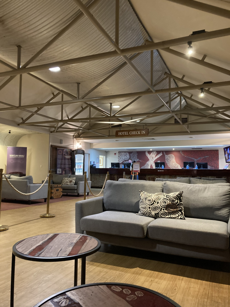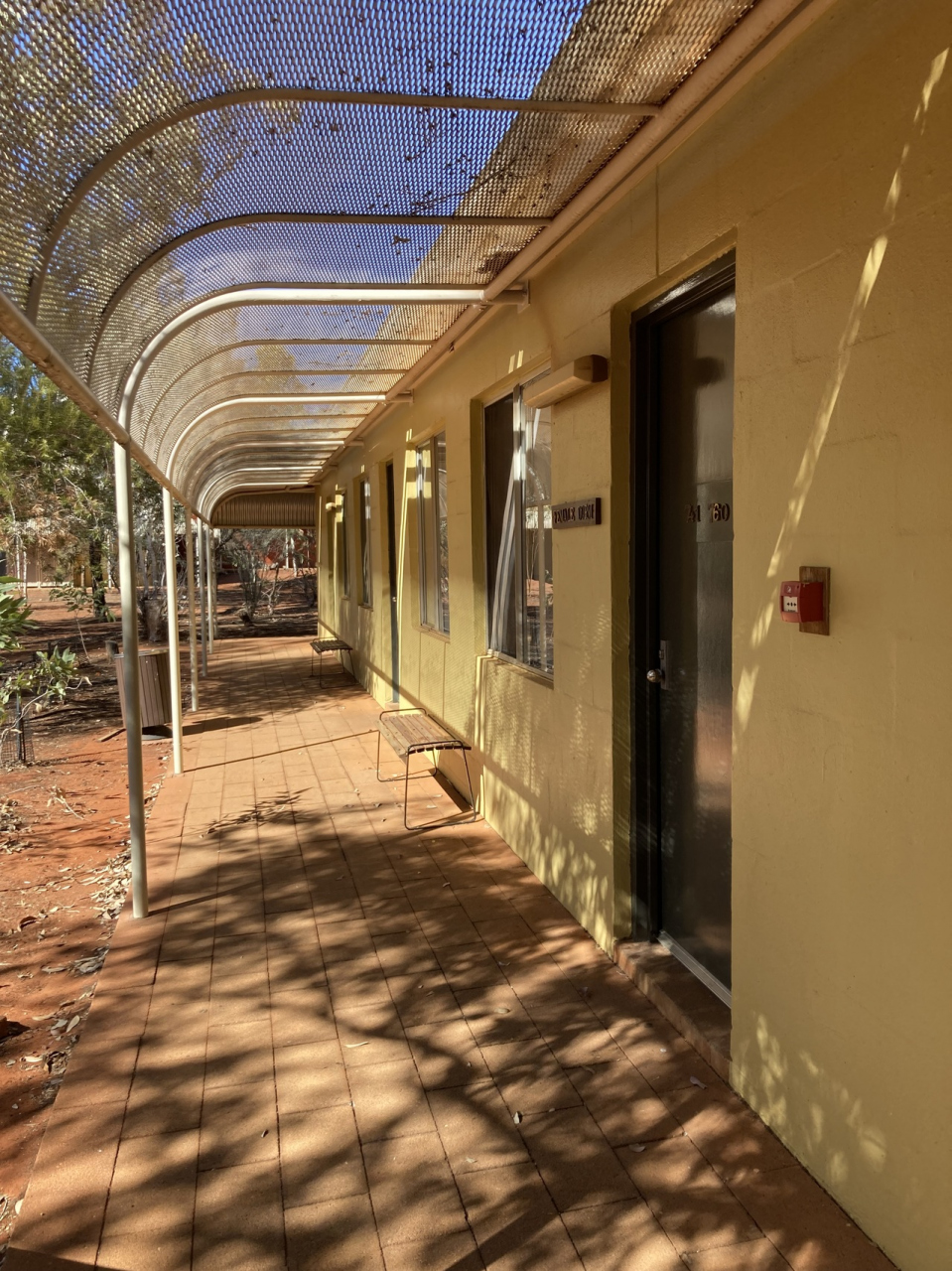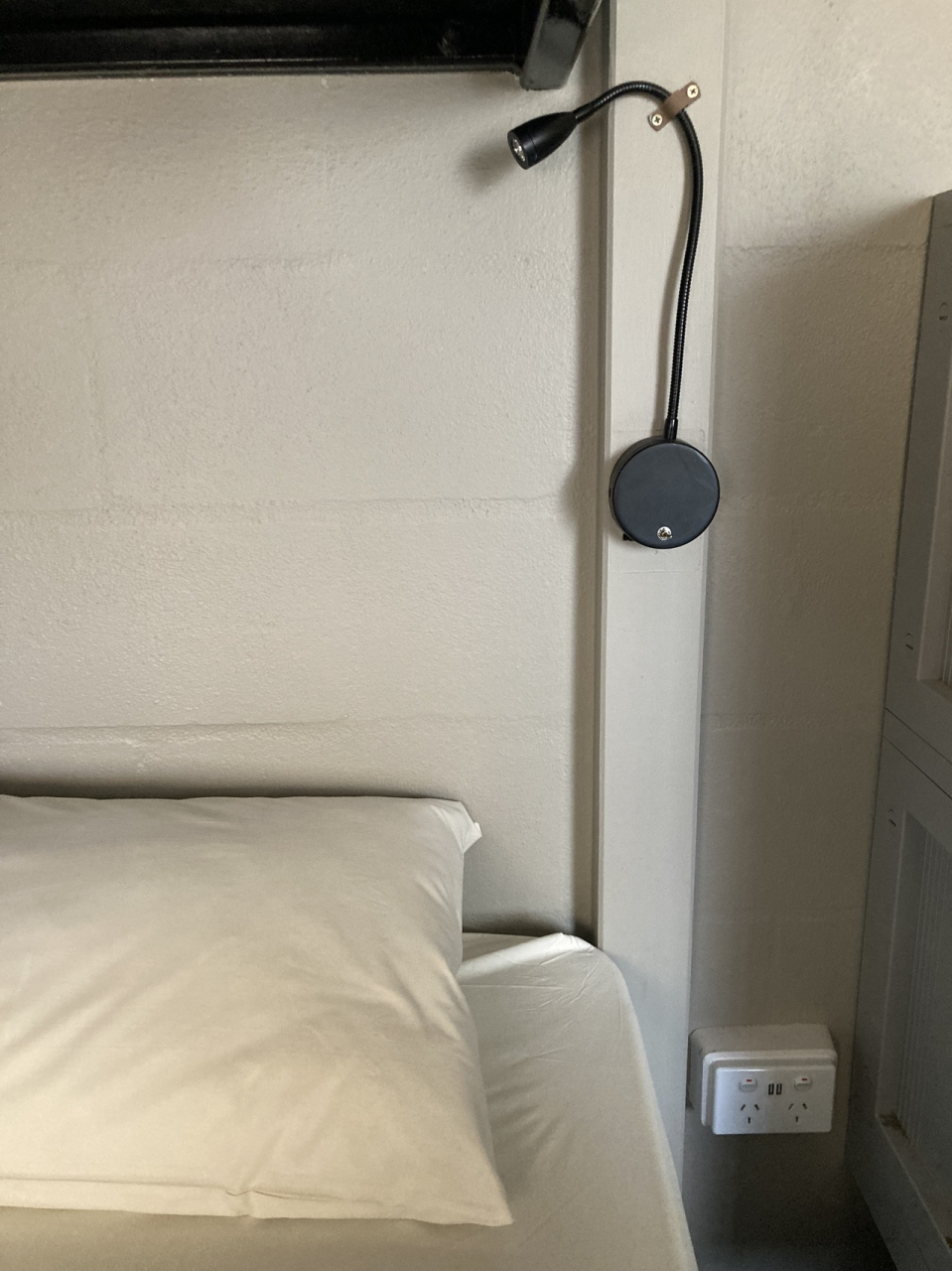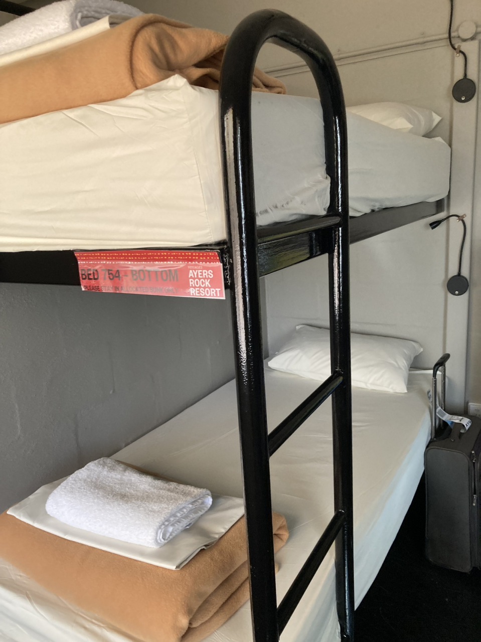 エアーズロックでちゃんとしたホテルに一人で泊まるには高額になり、ここは5000円以下だったので、山小屋に泊まると思えば、清潔な寝床があるだけでよかったです。コンセントはベッド脇に2つありました。トイレとシャワーは離れの建物になってました。シャワーはぬるめで、暖房も入っていない感じだったので冬は寒いと思います。