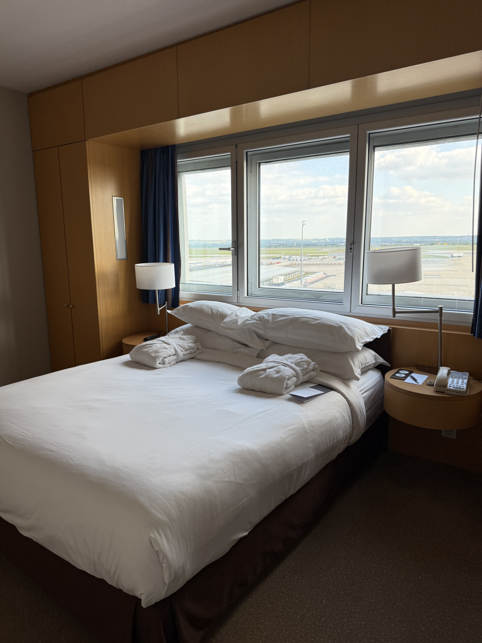 ヨーテルとともに唯一空港に直結しているホテルですね。そのせいか、値段は割高ですが、チェックアウトの時にドアマンがすごく気が利いていて、カート使う?とさっと出してくれました。ターミナルまでに段差はありますが、エレベーターもあるし、使い勝手はいいです。ただ、このホテルに向かう途上にあるエール・フランスのチェックイン機械付近にいる係員を装う、チェックイン代行するわよ?みたいなおばさんには要注意。お金とられるそうで、先に到着していた、同行者が困っていました。スイートにアップグレードしてくれたので、ミニバー無料、朝食も無料、ラウンジもどうぞと至れり尽くせりでしたが、ラウンジは本当に狭いのと、飲み物程度しかありません。Wi-Fiは割と早くて使いやすいです。部屋の向きによって見える景色も違うのでしょうか?私に部屋からはいろいろな航空会社の飛行機がよくみえてなかなか楽しかったです。