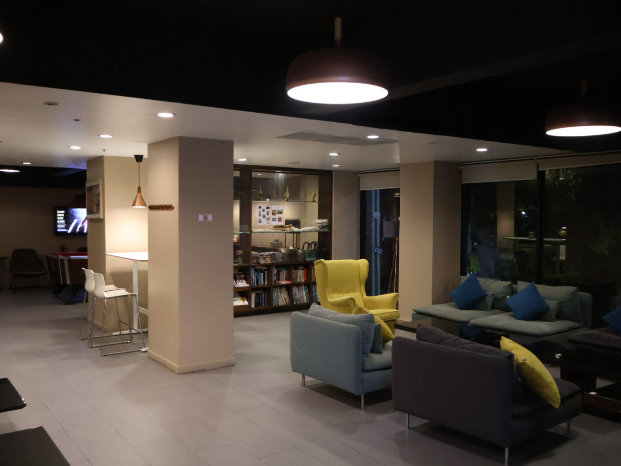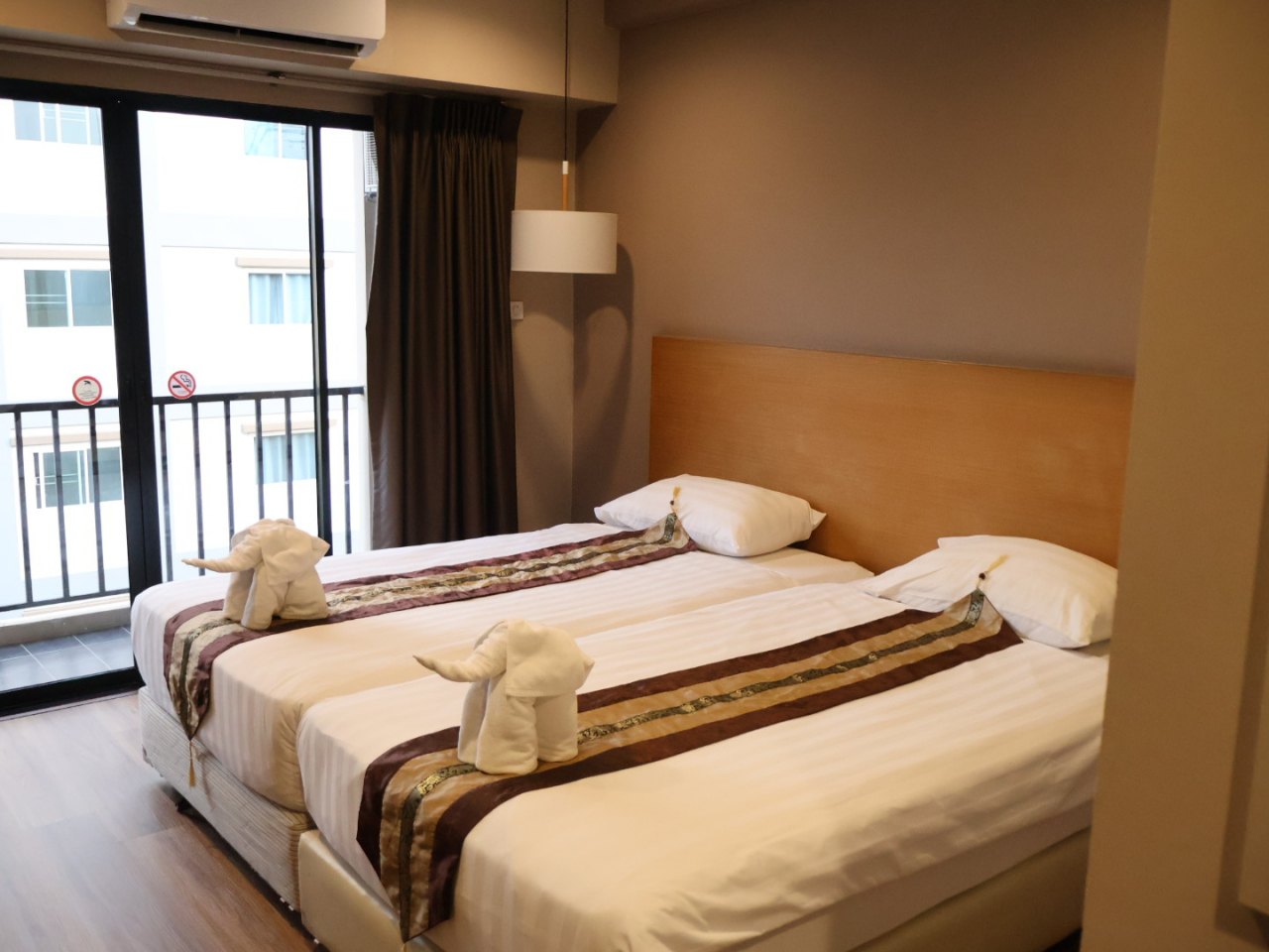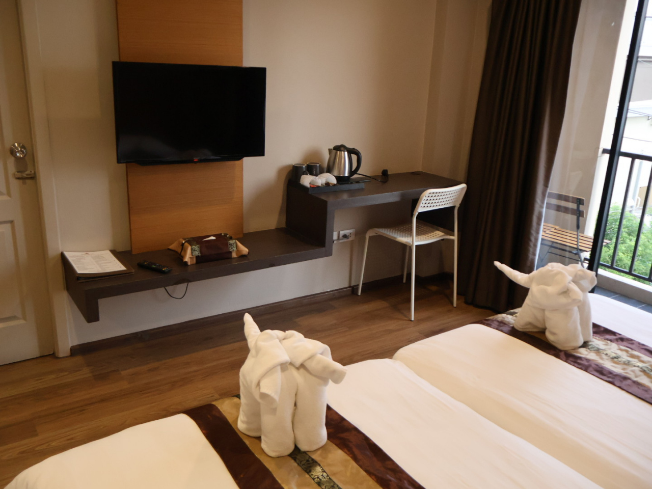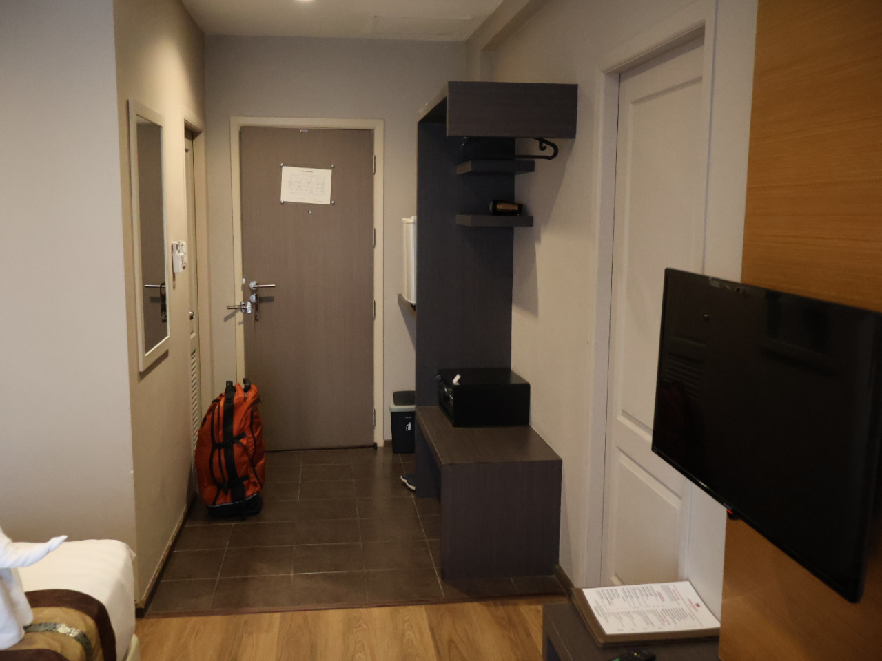 フロントスタッフはフレンドリーで部屋は広くないものの帰国前の前泊には十分な広さです、清掃もいきとどいており、冷蔵庫、セーフティボックス有。ホテル前の路地にはタイ食堂やマッサージ屋があります。大通りに出て東に少し歩けば大きなショッピングモールもあり、最後のお土産を買うのに便利でした。全体的に、空港へのアクセスや買い物、マッサージなどの立地や環境は良いホテルでした。