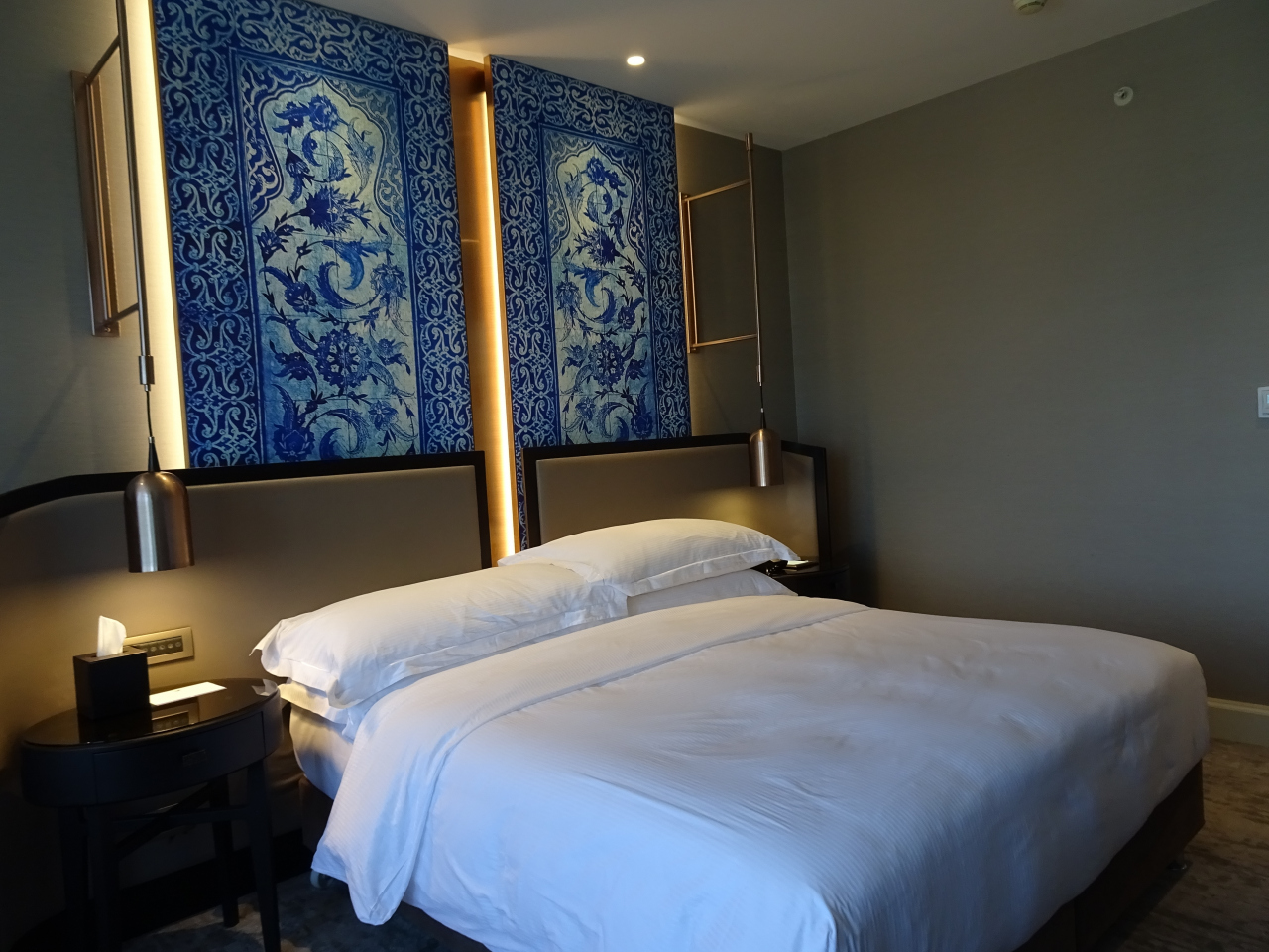 客室はダブルルーム、電灯で浮かびでるトルコブルーの壁紙がとても素敵でした。