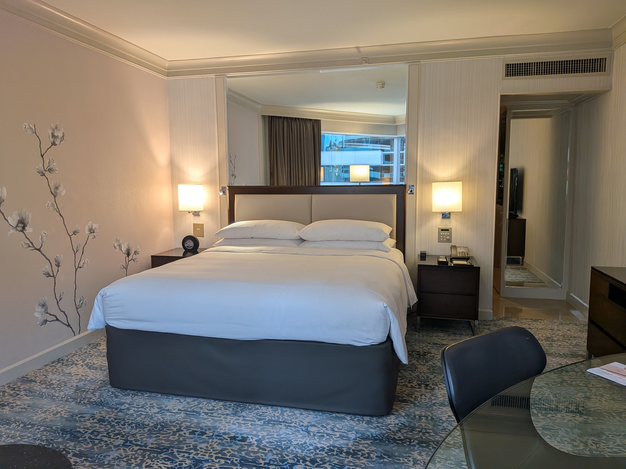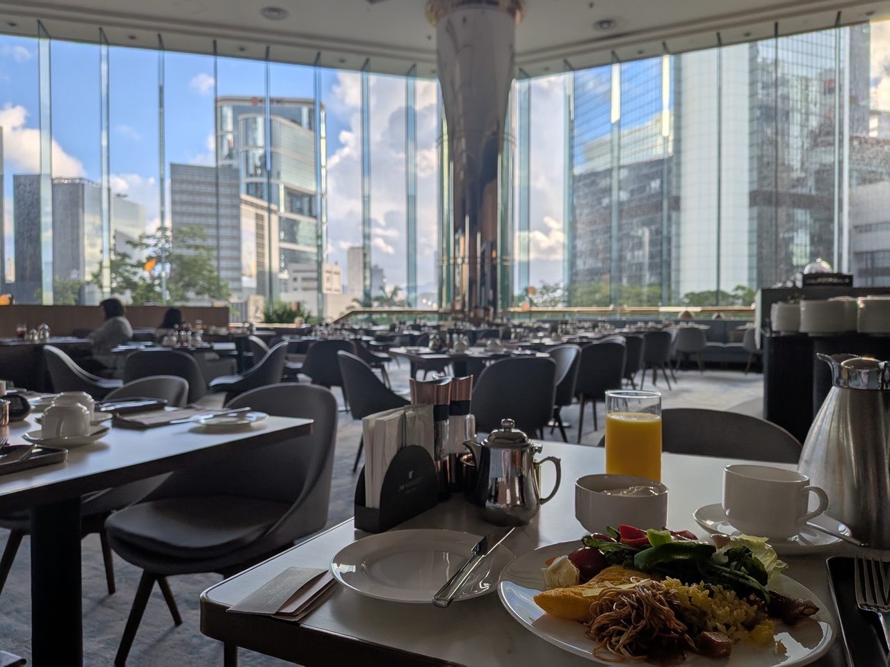 香港出張での定宿で、前回は5月後半に2泊、今回は6月末~7月初で各2泊しました。部屋は少し狭いのですが、ロビーやレストランなど含め、高級感があると思います。部屋は狭いといっても、バスタブと、独立したシャワーブースが備わっていて設備は贅沢でした。また、朝食レストランは2フロア吹き抜けで、壁は一面の窓。朝のさわやかな空を眺めながら食事を楽しめました。ビュッフェスタイルですが、卵料理や麺料理、フレッシュドリンクはその場で作ってくれて、美味しかったです。