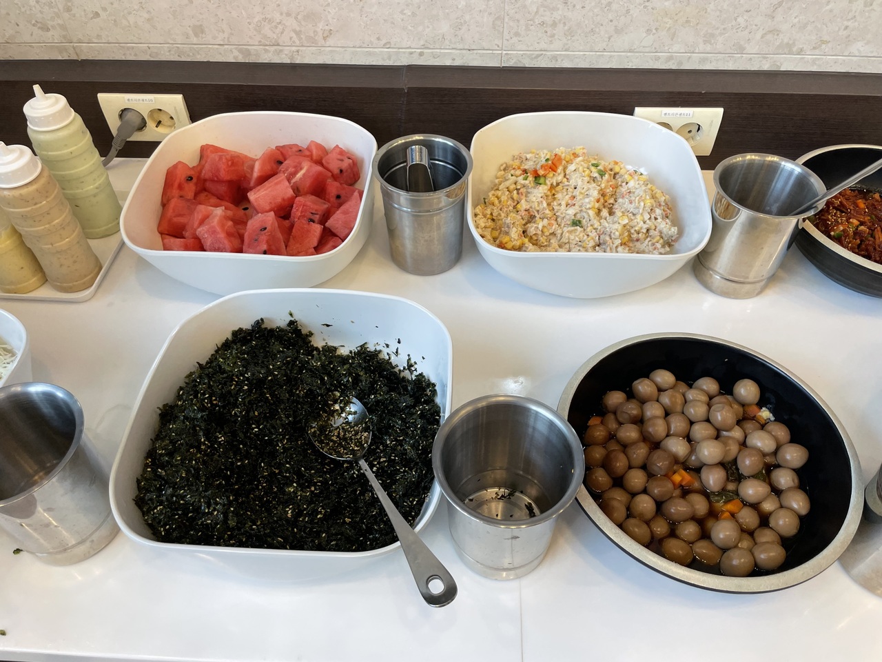 部屋はいつも安定の東横イン品質。ビュッフェ式朝食にはおかずが並び「家庭っぽい」料理を堪能できます。季節のスイカも並びおいしくいただきました。