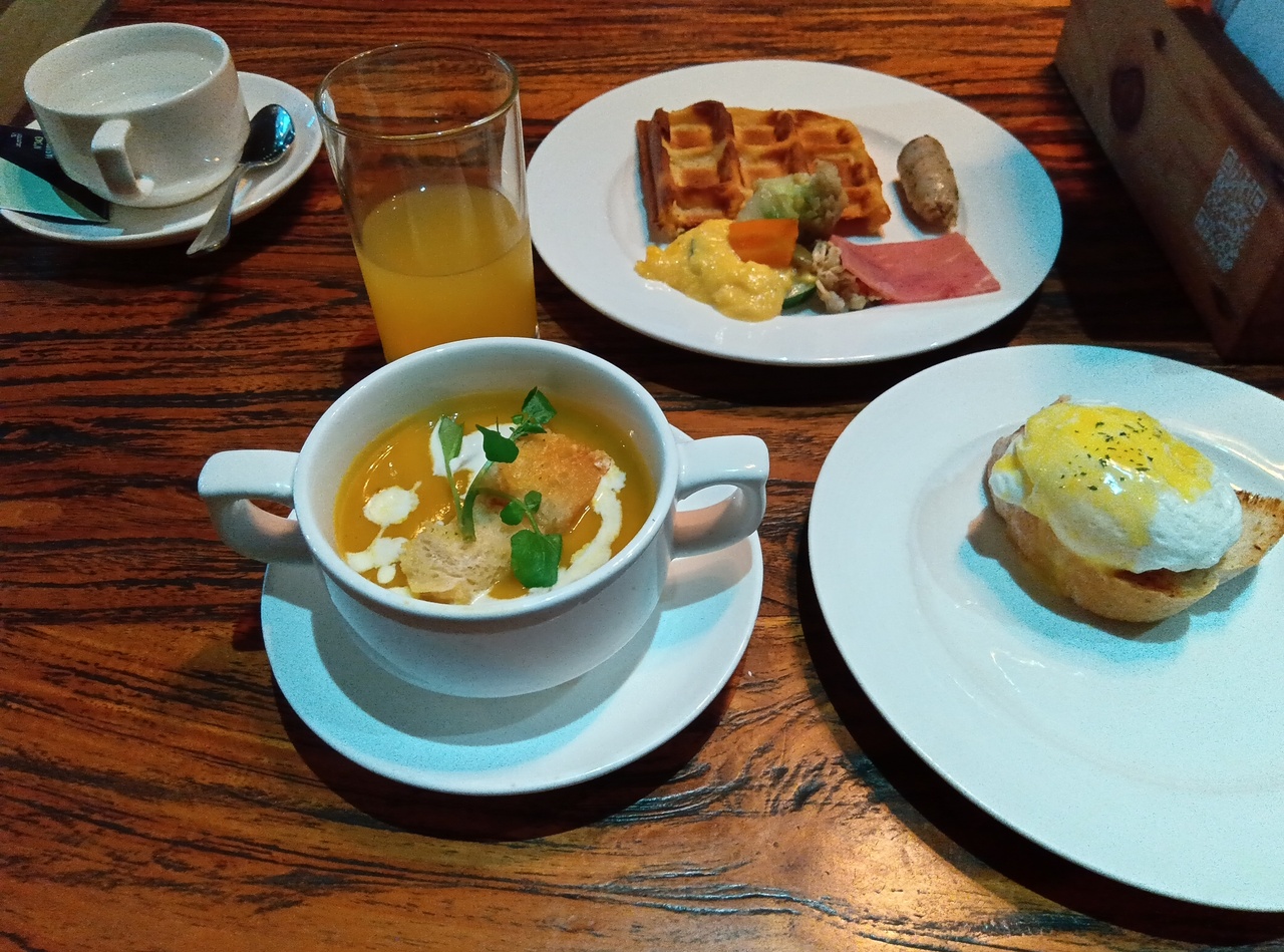 【朝食】1人15万ルピア。プラチナギフトで選択したが、選んでサインする用紙に朝食は印刷されていなかったので今だけかも。スペシャルな会員へとのことでパンプキンスープをいただいた。他のフェアフィールドよりこじんまりした感じ。