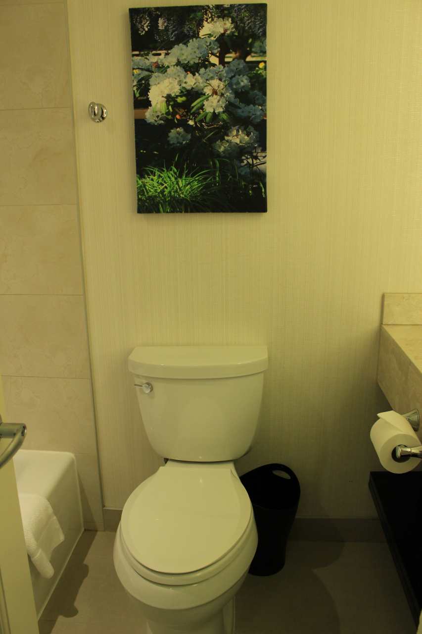 ホテルの場所はまわりにレストランもいろいろあり、便利な場所です。スカイトレインのバンクーバーシティセンター駅からホテルまでは約10分です。スーツケースを持っていると、少し遠い距離と感じるかもしれませんが、バス停が近くにあるので、市バスを使って観光する場合はとても便利です。