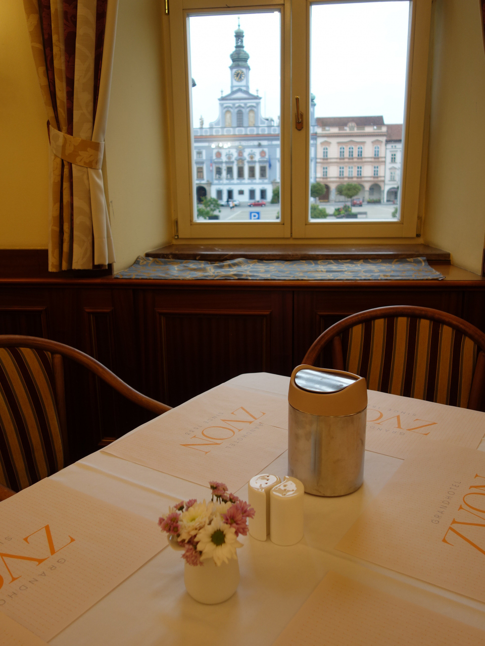 チェスキークロムロフへの起点として、また、この街自体も良さそうだったこと、フルボカー城へも行ける、ビールが飲みたかったことから2泊しました。由緒あるホテルです、古いホテルは狭い部屋の所が多いように思うのですが家族なので選択したトリプルの部屋は広くて快適でした。子供がテレビのNETFLIXが入らないのをレセプションに言って直してもらうと一人で掛け合いに行ったのにもちゃんと対応していただけました(IT問題で直らなかったのですけど)。朝食は、広場に面した2階にあり、広場を眺めながらゆったりできます。