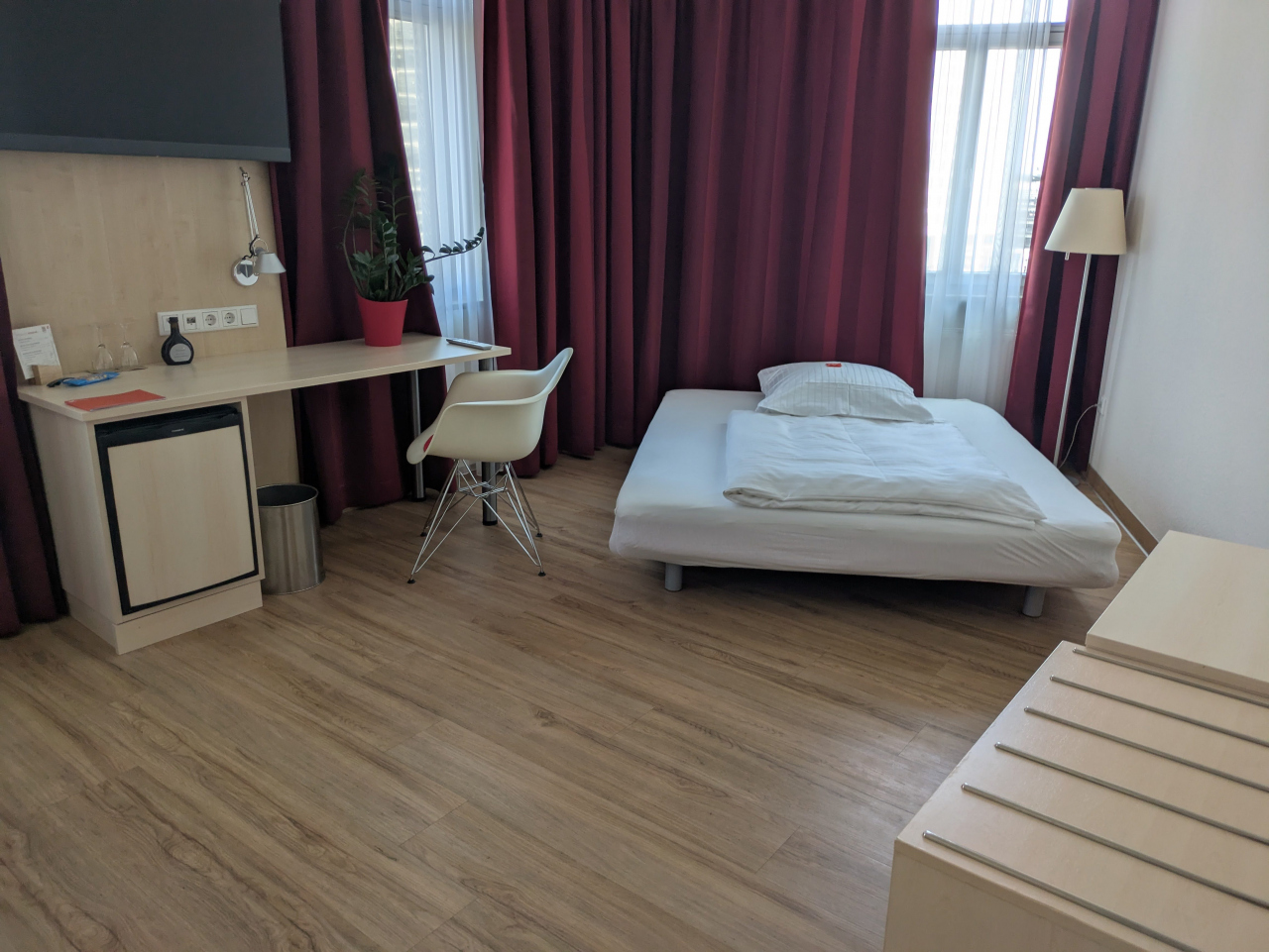 中央駅から歩いて数分、職人広場のすぐ近くです。部屋のカーテンを開けたとき、城壁の塔が目の前にバーンとそび立っていたので、思わず「きゃー」と叫んでしまいました。