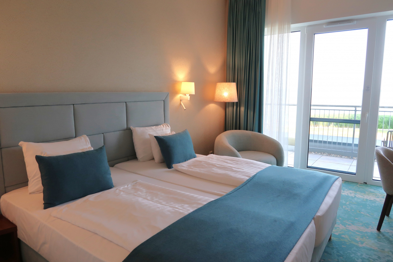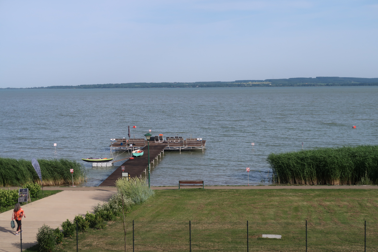2023年に開業したばかりの、バラトン湖畔にあるリゾートホテルです。最新ホテルだけに、全館エアコンがきちんと効いていて涼しく快適でした。エレベーターを降りてすぐの部屋だったので、窓からは湖で泳ぎたいゲスト用のホテル専用桟橋が見えました。ケストヘイ観光のために宿泊したので利用はしませんでしたが、7つのプール、10のサウナがある広いスパエリアも併設されていました。