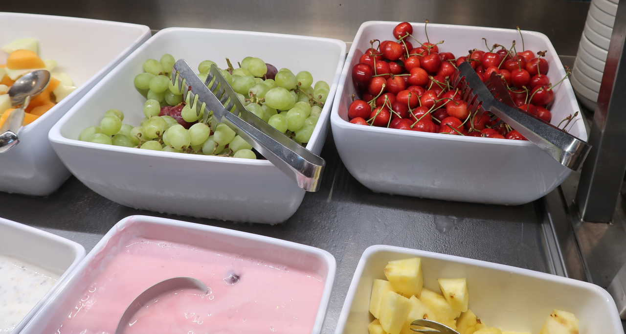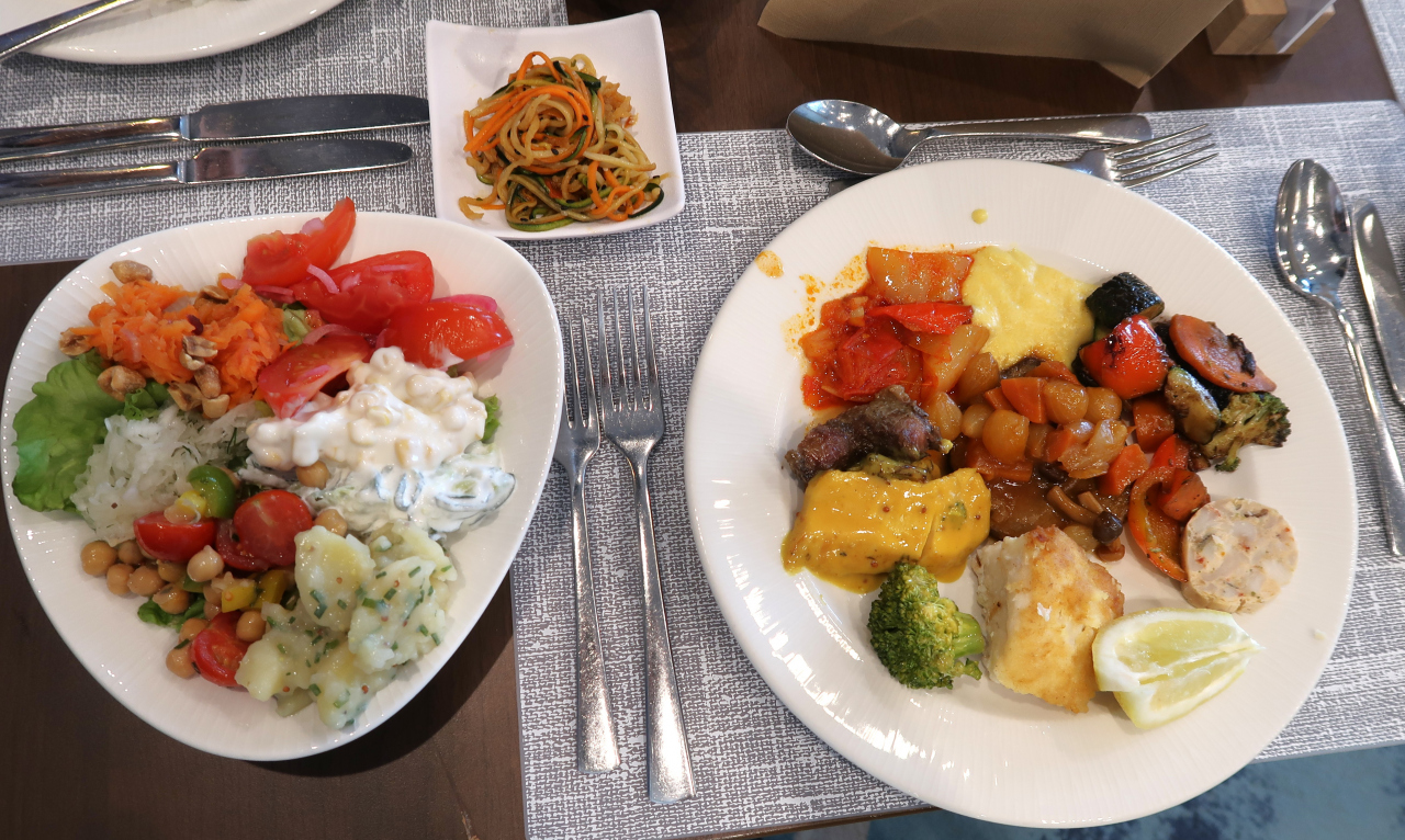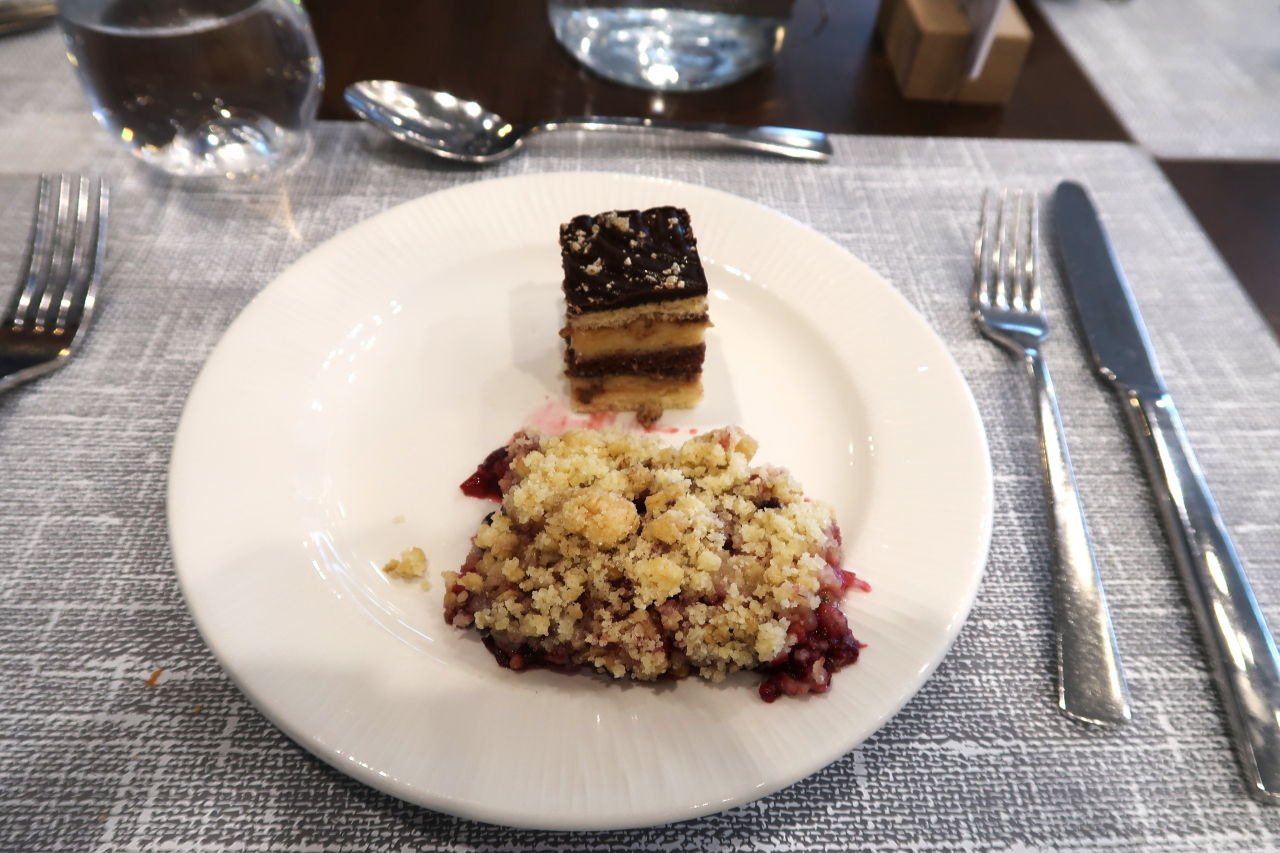 食事はハーフボードで、夕食もビュッフェスタイルです。驚いたことに、お料理を取りに席を外している間に、まるで日本にいるかのように、無料の冷えた水道水が入ったカラフェがテーブルに置かれていました。欧米でこのようなサービスを受けたのは初めてです。さくらんぼビールのあるハンガリーですが、朝食ではフレッシュなさくらんぼ、サワーチェリージュース、さくらんぼのヨーグルトと、旬のさくらんぼを満喫することができました。