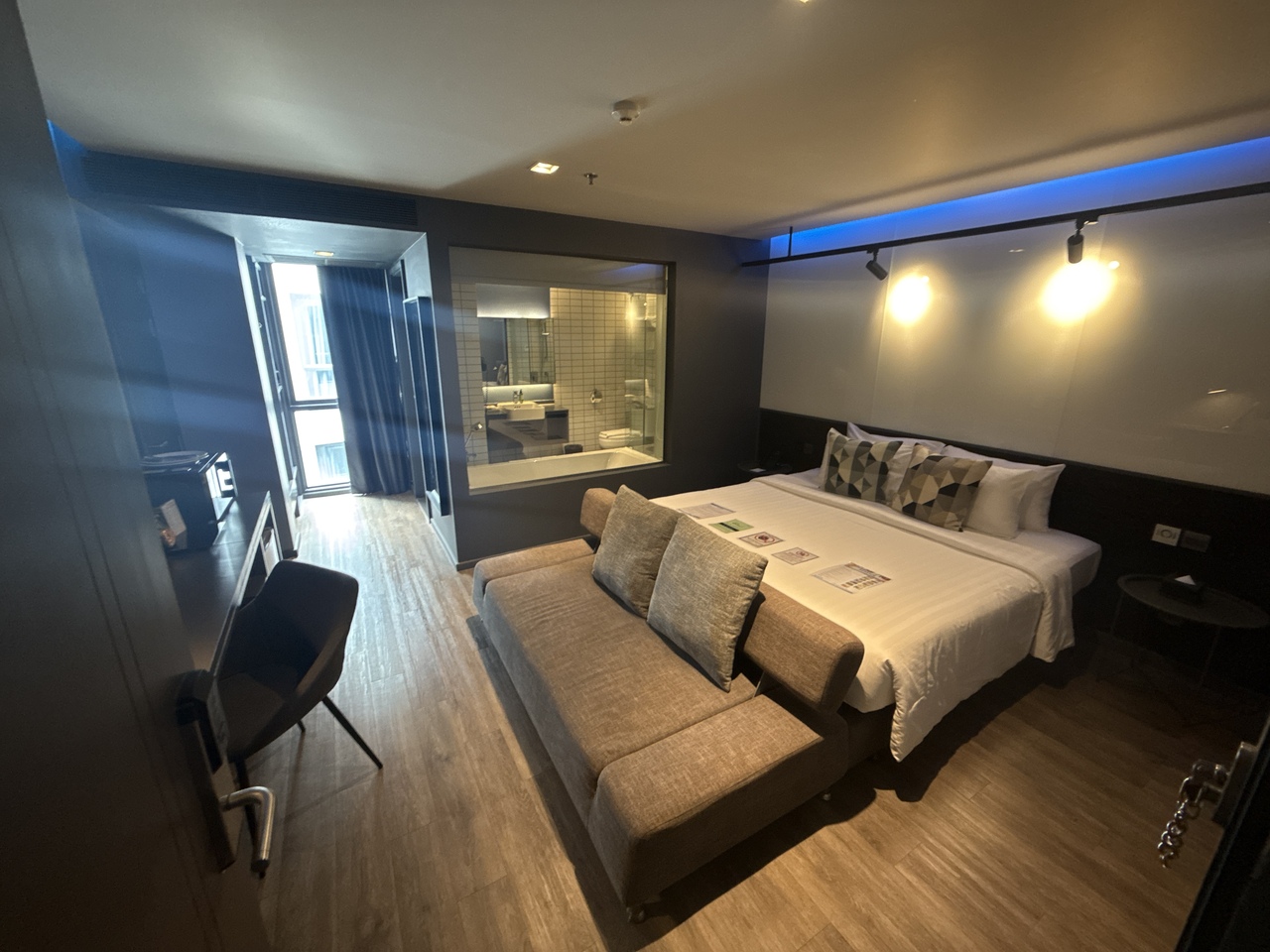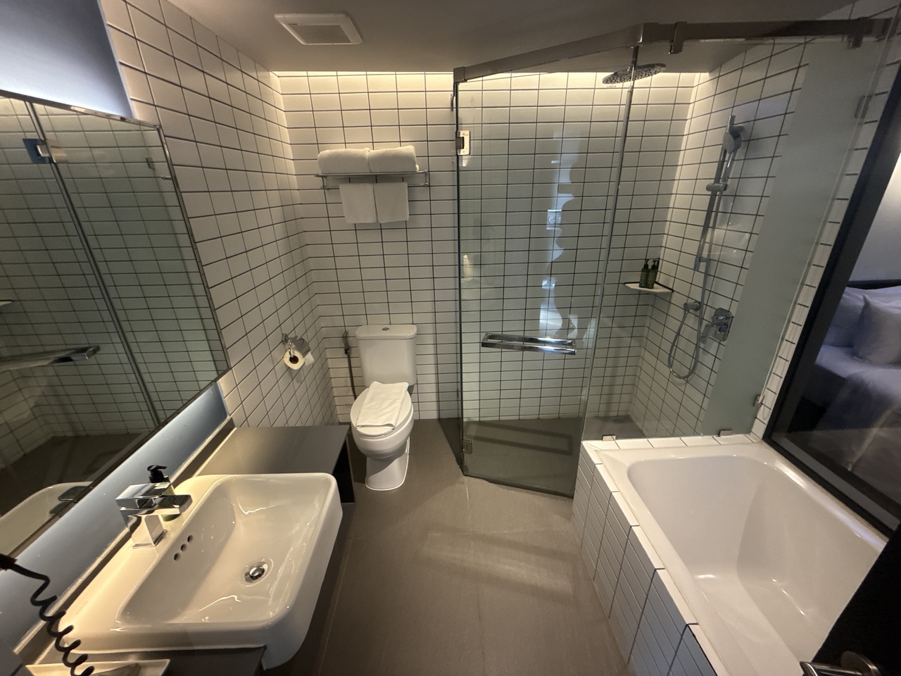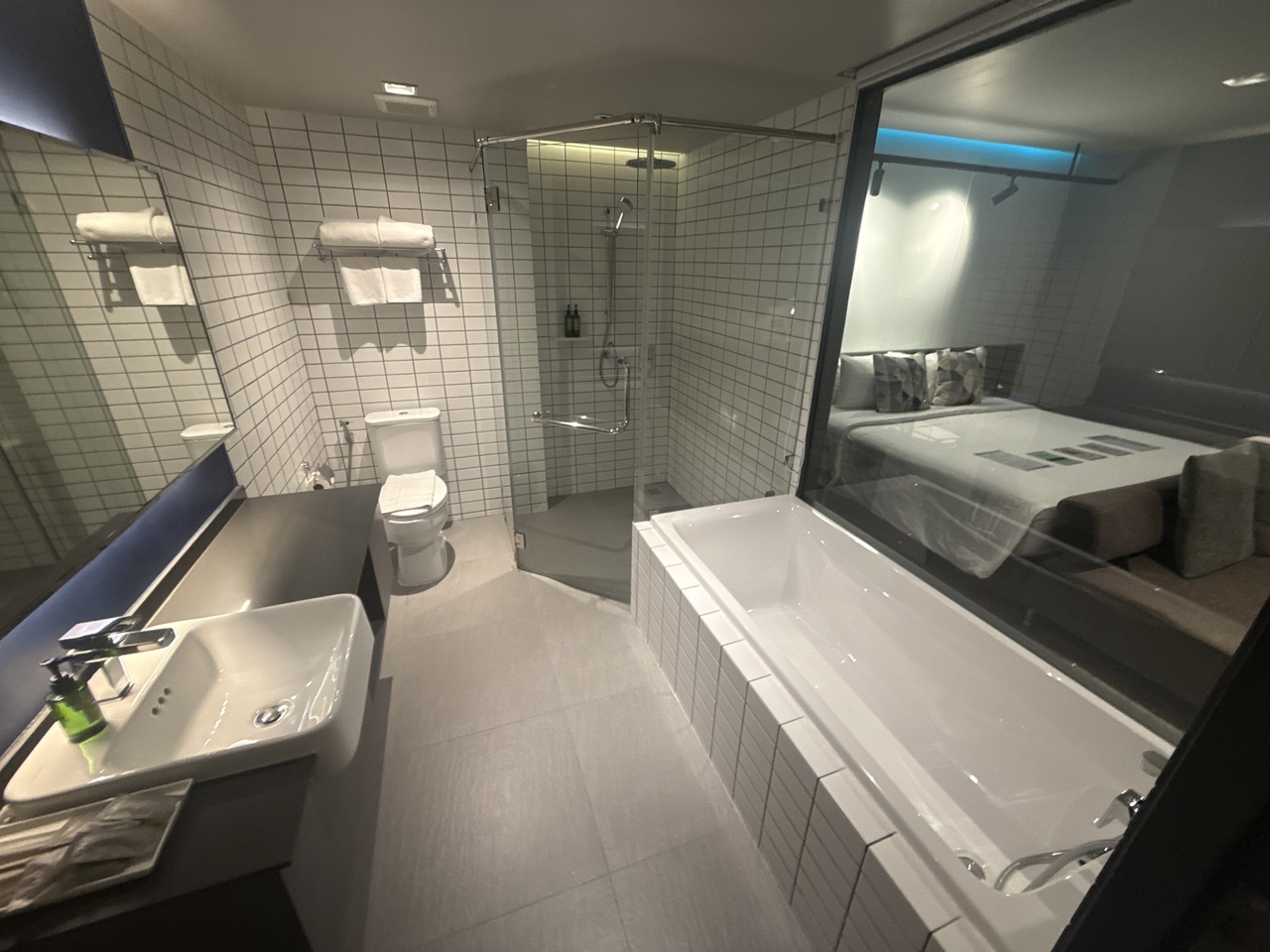 バンコクシーロム近辺を散策する際、近くにあるハイホテルに泊まっていましたが、円安と価格高騰の影響でコスパの良いホテルを探していましたが、最近はこちらのウォーターシーロムbyUHGホテルに落ち着いています。今回は2泊で上階をリクエストしていましたがチェックイン時(18:00頃)空きが無く、1階になりました。2日目は変更するとの事で対応してもらうましたが、このホテルは3棟になっていて、初日の1階の部屋は3棟、2日目は2棟に移動しました。そこで棟の違いは、3棟の方が洗面部分の洗面台、シャワーブースも広くとってあり、ゆったりしていることがわかりました。参考になれば、