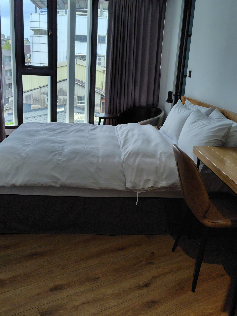 前回宿泊してよかったのでリピート。自分の大好きな宮原眼科と同じデザイナーの設計で、フロントエリアはおしゃれ。またお部屋は窓が広めにとってあるお部屋になったのでかなり明るい感じ。お部屋に1969 ブルースカイのマークのはいった漁師バッグがおいてあり、そちらにお菓子がはいっておかれています。漁師バッグはもらえないです。有料で200台湾ドルで購入できるそうです。部屋にはコーヒーメーカーもおいてあり、1969 ブルースカイ のロゴ入りのカップがおいてありました。