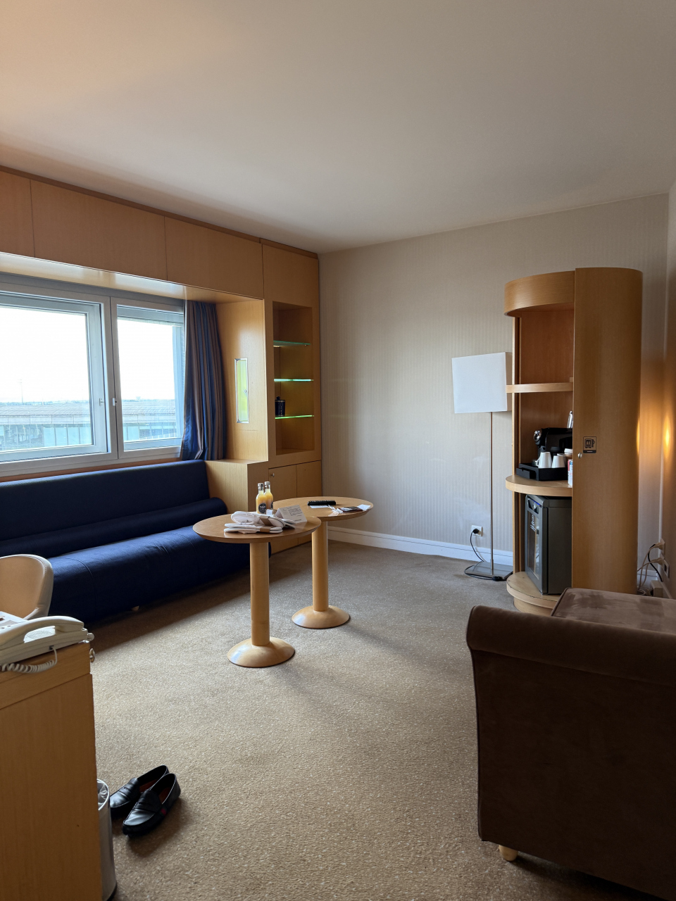 シャルル・ド・ゴール空港敷地内唯一のホテルで、駅にも近く、利便性は高いです。近隣にお店も多くありますが、日本やアジアと違い24時間営業しているわけではありません。また、空港内にもいろいろな人もいるので、そのあたりも気をつけてほしい場所。ホテル内には警備もきちんとしているので、かなり安全です。ただ、ここのラウンジは客室を転用しているのか非常に狭く、飲み物以外はほぼありません。スイートはミニバーもすべて無料でした。