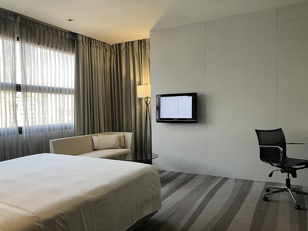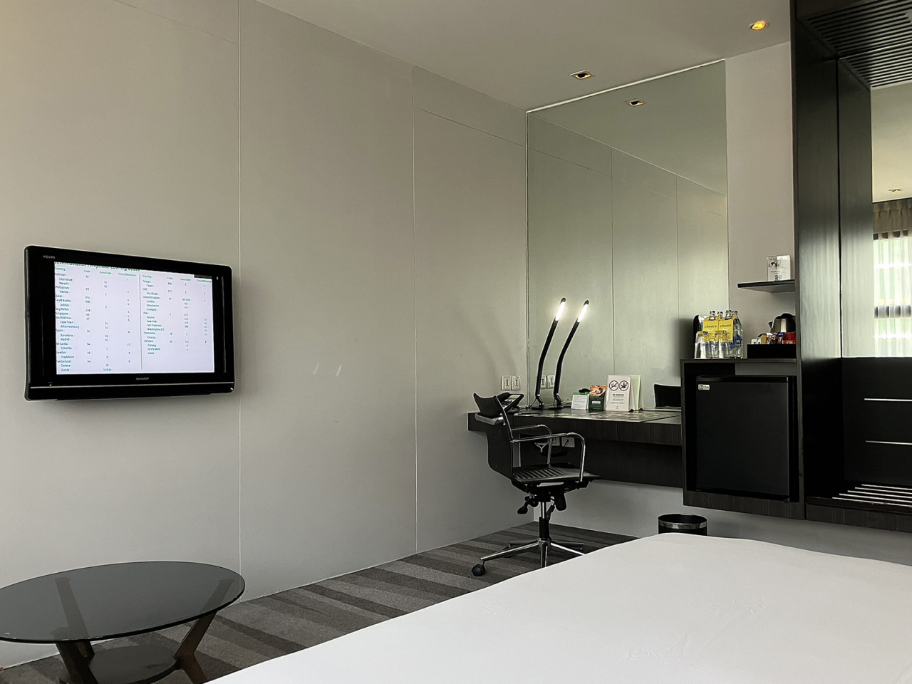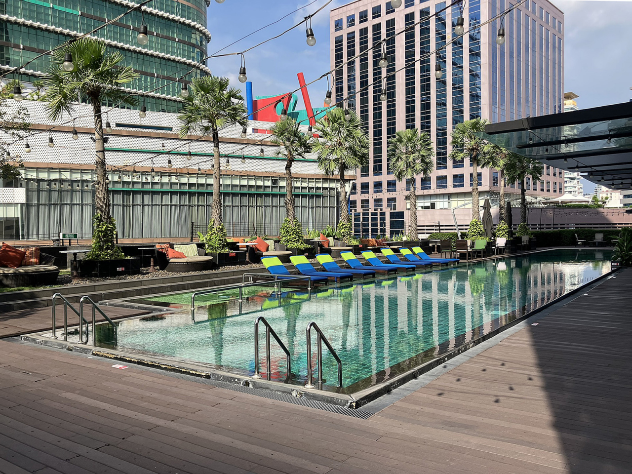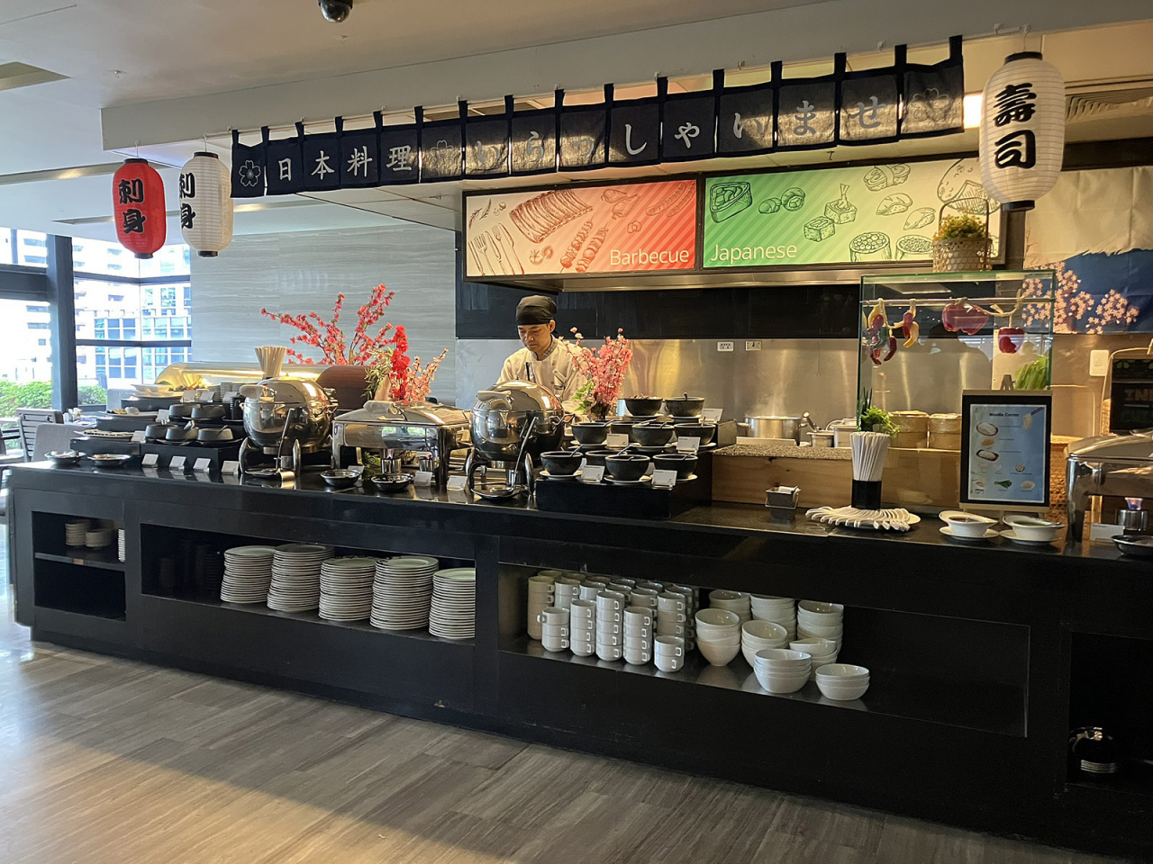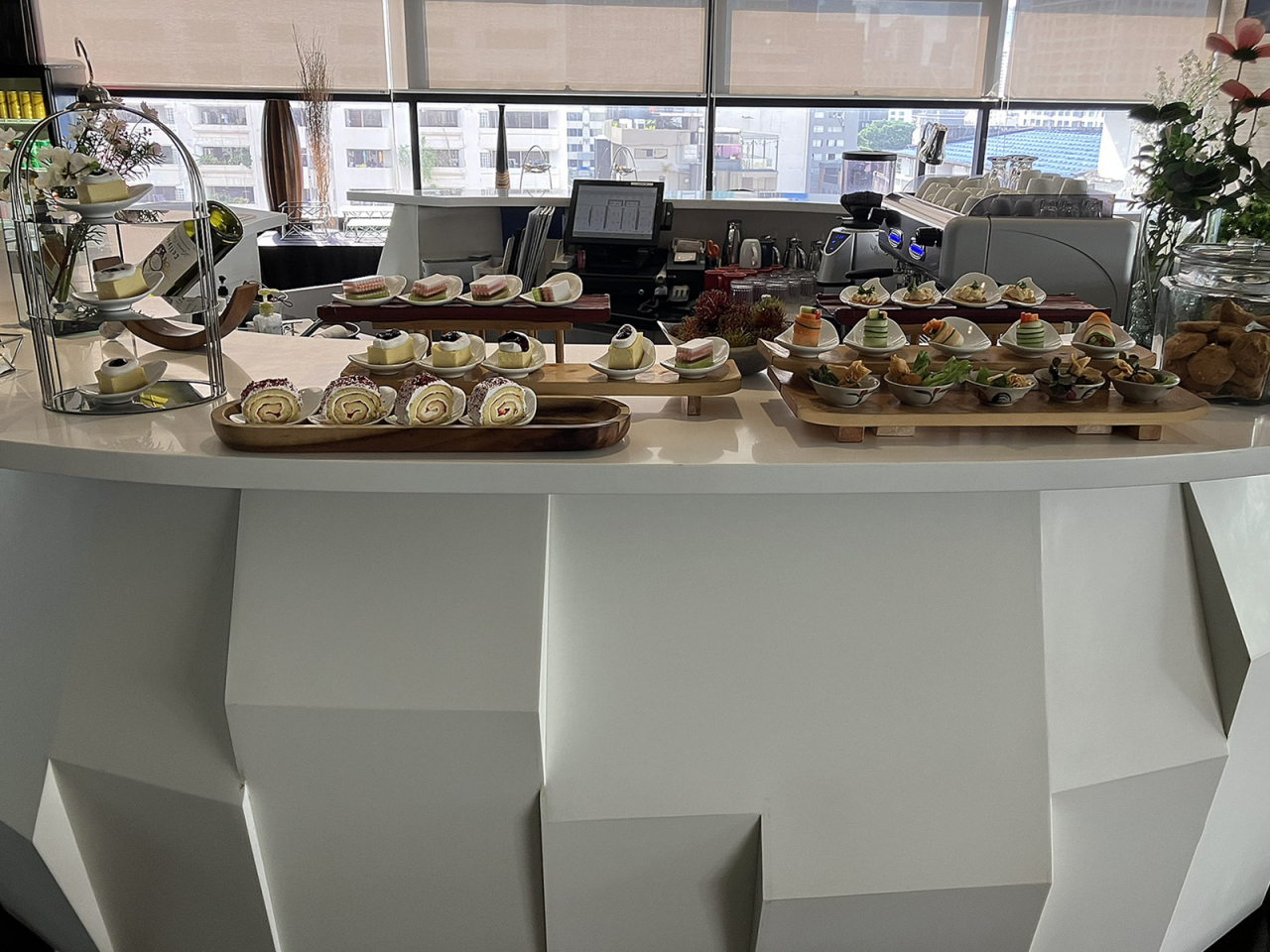 スクンビット通りソイ22の入口、かなり斬新な建物なので目立ちます。ただ、ちょっと中途半端な場所でもあり、使い勝手は今一歩ながらシャトルバスも運行されています。開業年に利用して以来、12年ぶりに宿泊しました。スクンビット通り沿いの入口脇にある日本語表示からは、かつてバンコクを訪れる外国人客のメインが日本人であったことを思い出させてもらえました。館内に入ると、メインロビーが1階から9階に移動していたことに少し驚きました。客室は以前と同じく1キング・プレミアにアップグレードしていただきました。黒色を基調とした客室デザインやバスタブのあるバスルームは、多分に日本人ビジネスマンも意識したものであったのでしょう。スタッフの接客も良く、ウェルカムスイーツが届けられるなどのサービスも良かったです。また緑の多いスイミングプールではリゾート気分も味わえます。クラブラウンジは至れり尽くせりといった雰囲気ではありません。クラブベネフィットの朝食ですが、朝食時間にラウンジは開いていないため、8階のブッフェレストランでいただきますが、そのレストランにも日本料理店をイメージしている一角があるのを見るにつけ、少しだけ郷愁が募りました。(笑)