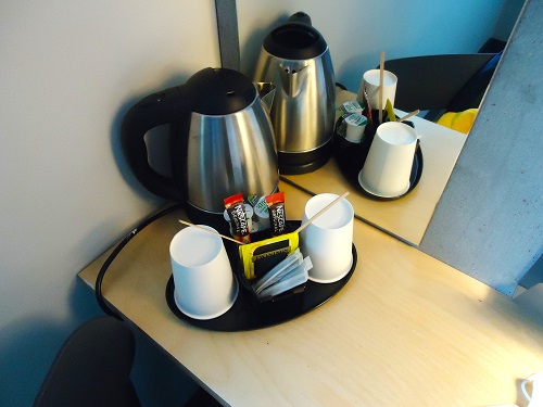 「イビスバジェット」らしく、狭い部屋にはティッシュペーパーも、バスマットも、ドライヤーまでも無い程の徹底ぶりですが、イギリスらしくティーセットはありました。(でもカップは紙コップ)