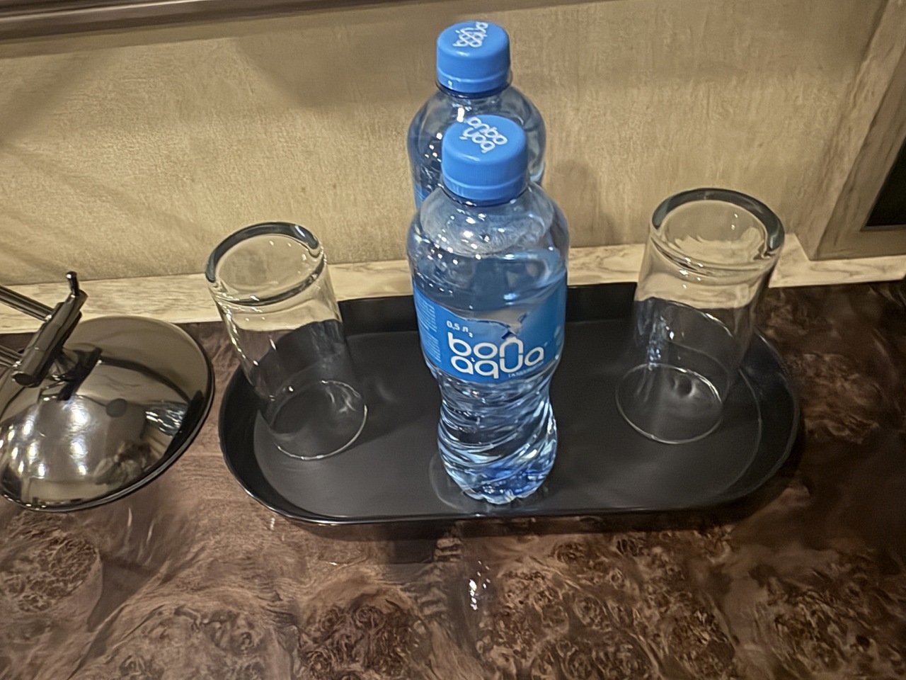 ミネラルウォーター2本、ポット、中は空の冷蔵庫あり。
