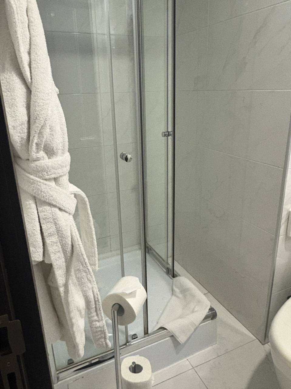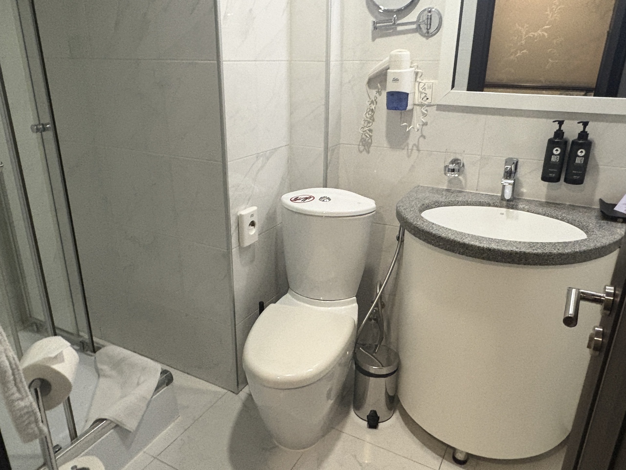バスルーム。シャワーのみ。コンパクトですが、清潔感はあり。トイレットペーパーホルダーがなんだかおしゃれ。バスタオルも大きめ。