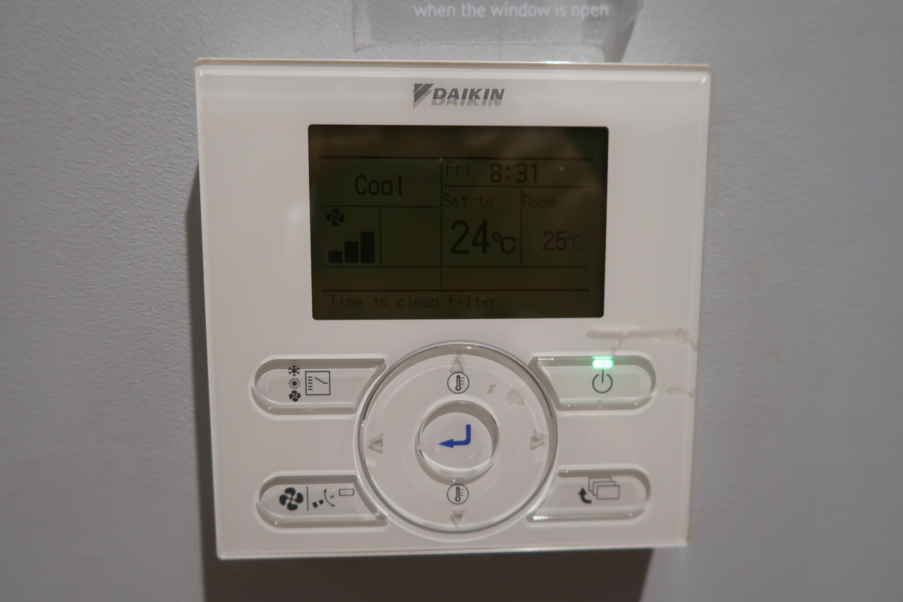 きちんと稼働するエアコンがあるホテルとして選びましたが、行ってみるとダイキンのエアコンが設置されていて、期待通り快適に過ごせました。部屋には収納棚や電源もたくさんあります。バスタブ付きの部屋を希望していましたが初日は空きがなく、2日目からバスタブ付きの部屋に引っ越しました。