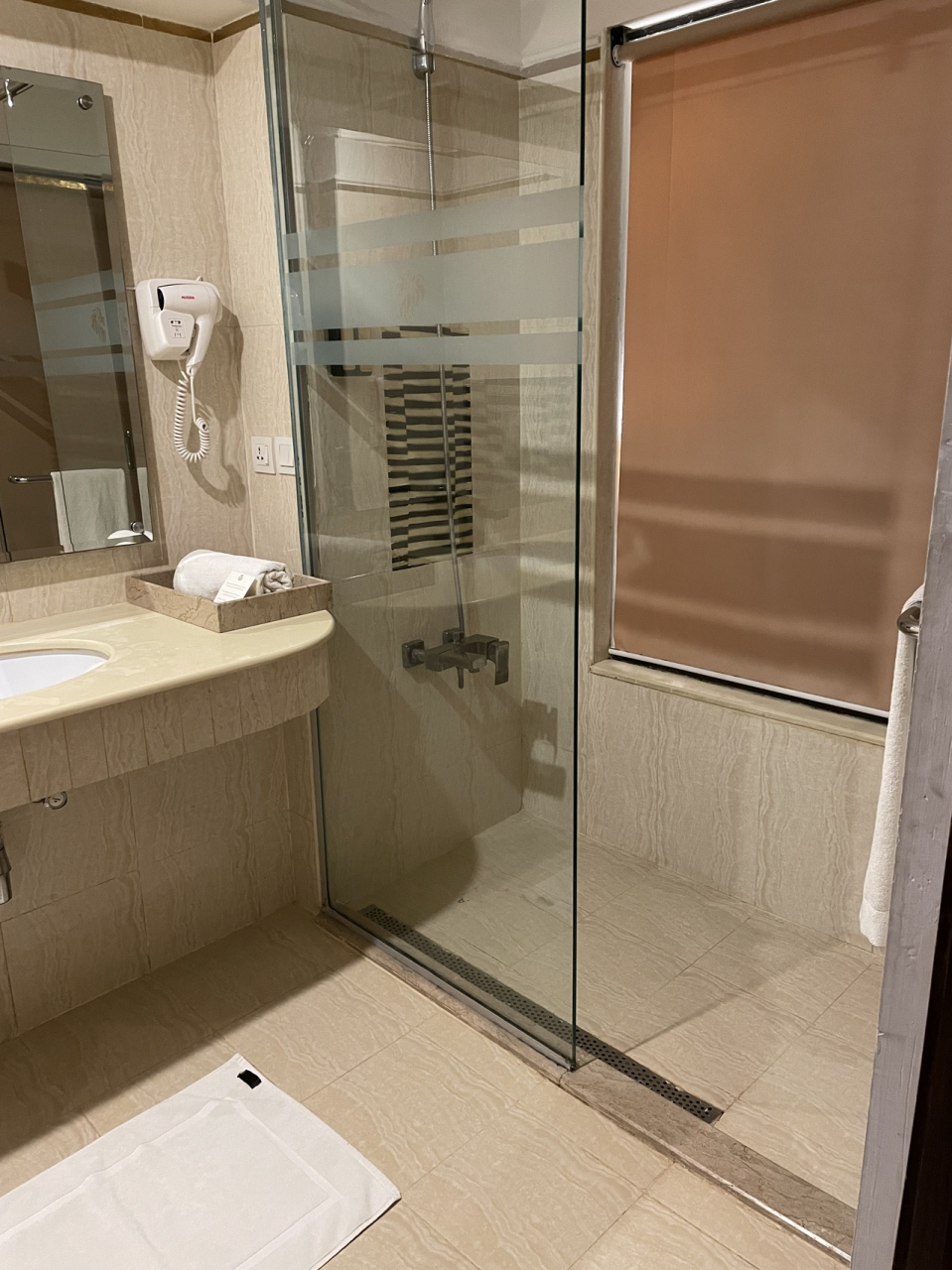 シャワーブースも広く、ちゃんとドアが閉まる。ただハンドシャワーをかける位置がとても高く、背伸びをしないとフックから外せす、諦めて固定式だと思って使おうかと思ったくらい。