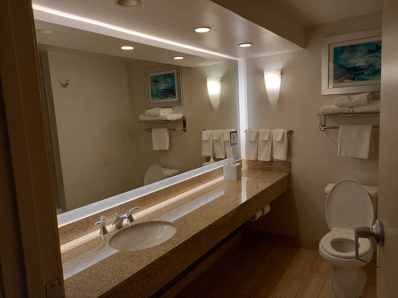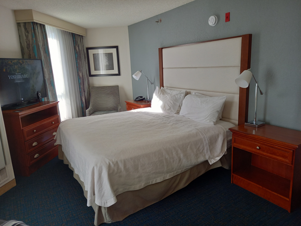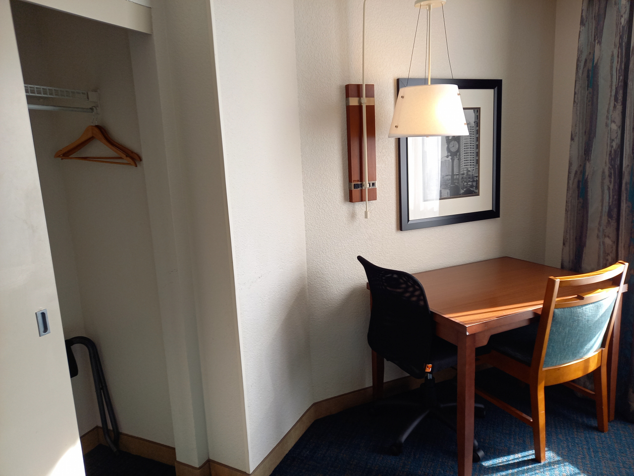 空港からタクシーでパイクプレイスの近くを通過しましたが混雑していました。周辺は静かな住宅地です。バス通りに面したお部屋で車の通過音が騒がしい時もありましたが激しい交通量では無いので気にはなりませんでした。キチネットは充実していてコーヒーマシン(ネスプレッソ)や冷蔵庫(我が家のモノと同サイズか?)、電子レンジ、ディスポーザまで備わっていました。食器(カトラリーやお皿、ボウル等)やフライ返しなどのガジェットもありました。バスタブが部屋の広さに比べ貧弱で、見た目こそ大きいのですがお湯が少量でたまるような規格でイマイチでした。掃除もイマイチ。贅沢な言い方ですが「無駄に広い」「一泊だけではもったいない」ほど快適でした。朝食はシリアルなどが中心の軽食スタイル。クルーズターミナルへのシャトルバンサービス(有料:10ドル/人)がありましたので大変、助かりました。