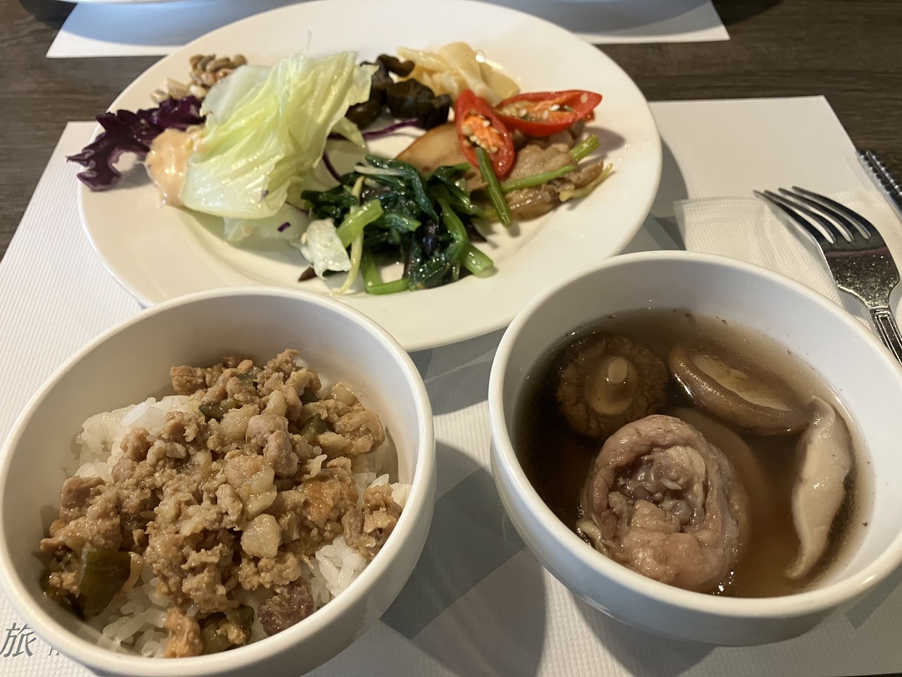 無料朝食付きでしたが、メイン料理は2品と少ないものも、お粥やルーロー飯もあり美味しくいただきました。