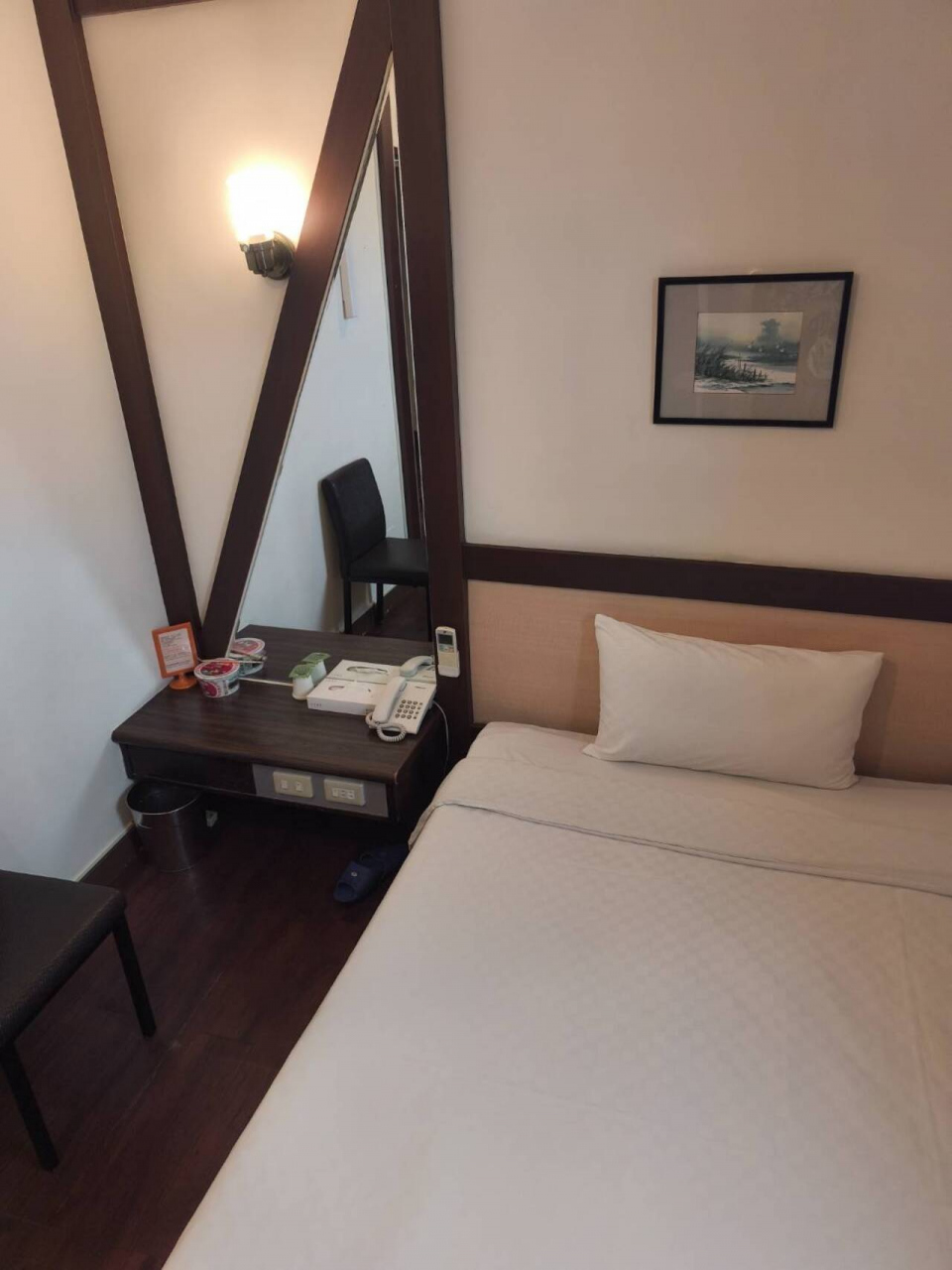 比較的リーズナブルなホテルなのですが、けっこうお部屋は狭めで窮屈な感じがしました。机がないというのはかなり不便さはありました。枕元のサイドテーブルと鏡台のハイブリッドみたいなものがベッドサイドにありまして、それが机のかわりになっているのかなって感じでしたが、やはり机がないとちょっとものを食べたり、書き物をしたりっていうのがしにくくて。あらためてホテルでは机の重要性を感じるお部屋でした。