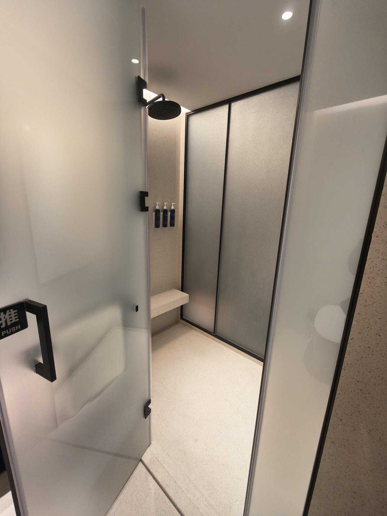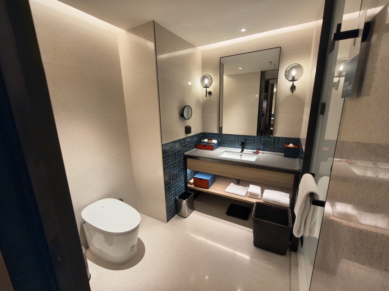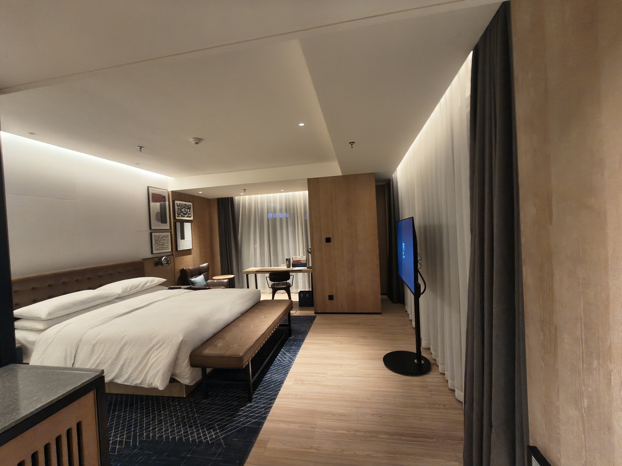 ベットサイドが充分広く、テレビモニタスタンドタイプで50インチ以上横長、シャワーの使い勝手(温度調整が楽なタイプ)で、新しく綺麗でそして広い。