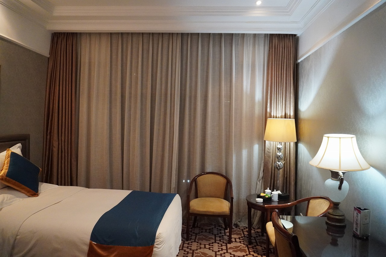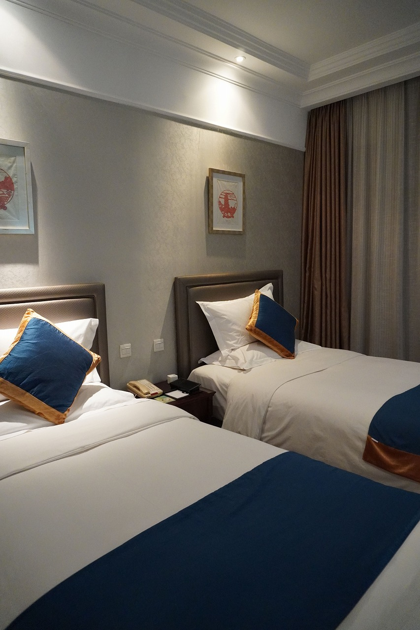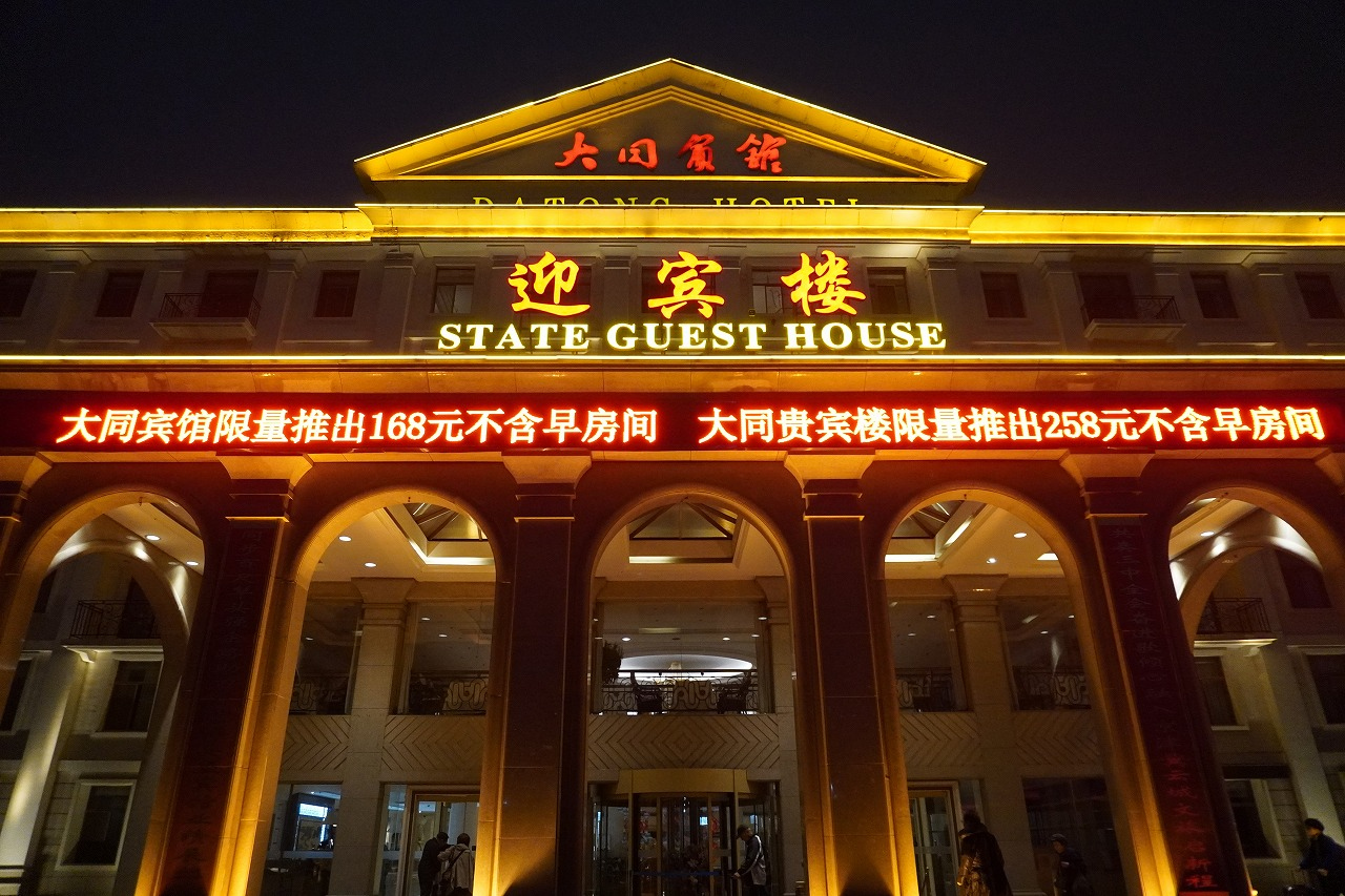 山西省のツアーで宿泊しました。宿泊は本館で開業当時は大同で1番のホテルだったということです。バスタブもあり、お湯の出も良いのでストレスなく利用でしました。部屋に無料のミネラルウォーターがありますが、冷蔵庫はありません。夕食はツアーに含まれており、本館の裏手にある貴賓館の2階にあるレストランでいただきましたが、品数も多く山西省の名物料理がいただけました。ビールはツアーの料金でも20元と北京や上海に比べると良心的です。朝食時は麺のコーナーでは名物の刀削麺をその場で作ってくれるのでパフォーマンスとしても楽し江ましたし、とても美味しかったです。ツアーでは大同の観光が無かったので、夕食の後に散策に出掛けました。ホテルの北側に20分ほど歩くと城壁が現れ、ライトアップされてとてもきれいです。城壁を越えると古い寺院や再現された街並みが現れます。有名な九龍壁も外から見ることが出来ました。このホテルに宿泊したら夜の散策はおすすめです。