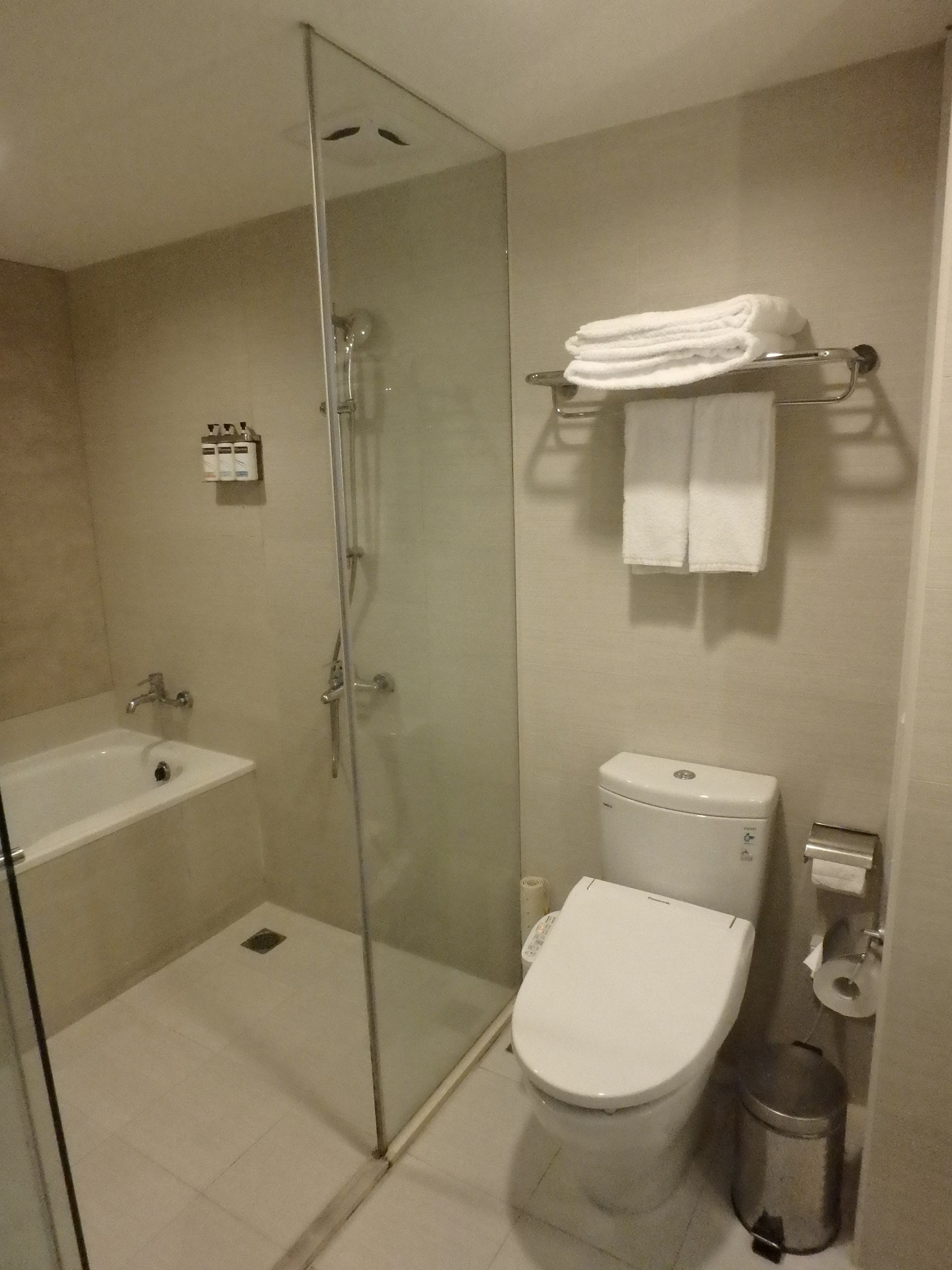 お風呂はバスタブ有りでお湯の量も豊富。なので毎晩湯船にお湯を張って1日の疲れを落とすことができた。日中はシャワーを何回か浴びたが浴室が広いので快適そのもの。トイレは....御多分に漏れずペーパーは流せない。でも総合的に快適に過ごすことができた。