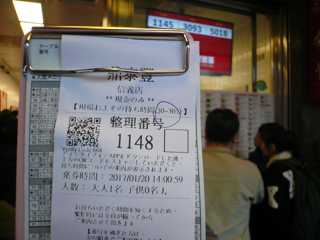 木曜日の18時頃に行って、約30分待ちでした。入店前、番号票と一緒にメニューとオーダー票を貰うので、いろいろ選んでいるうちに時間があっと言う間に経ってしまいます。