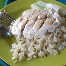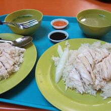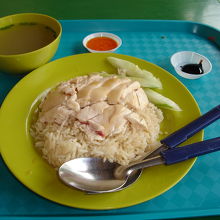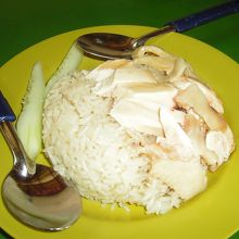 鶏のゆで汁で炊いたご飯の上に、茹でたチキンが乗っているチキンライスは$2.5か$3(サイズ)のものがあります。