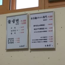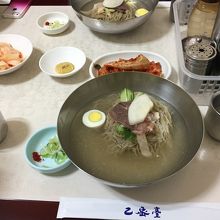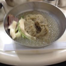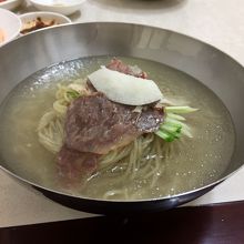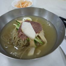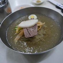 お店自体は30名~40名ほど入る大きさでしょうか、円卓でみんなワイワイ食べている感じです。お客さんが頼んでいるメニューは、概ね冷麺だけなので回転も良さそうでした。冷麺は氷が入った「普通の」冷麺と、「辛みソースに絡めた」冷麺の2種類から選ぶ形式で、それに暖かいスープ(テールスープ?)がサービスされます。氷が入った冷麺が段々とシャリシャリになってきますが、気にせず食べ続けます。麺はやや太めだったかと思いますが、食べやすくすぐに食べ終わったように記憶しています。今度は辛みソースの方も食べてみたくなりました。 閉じる投稿日:2013/11/19