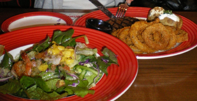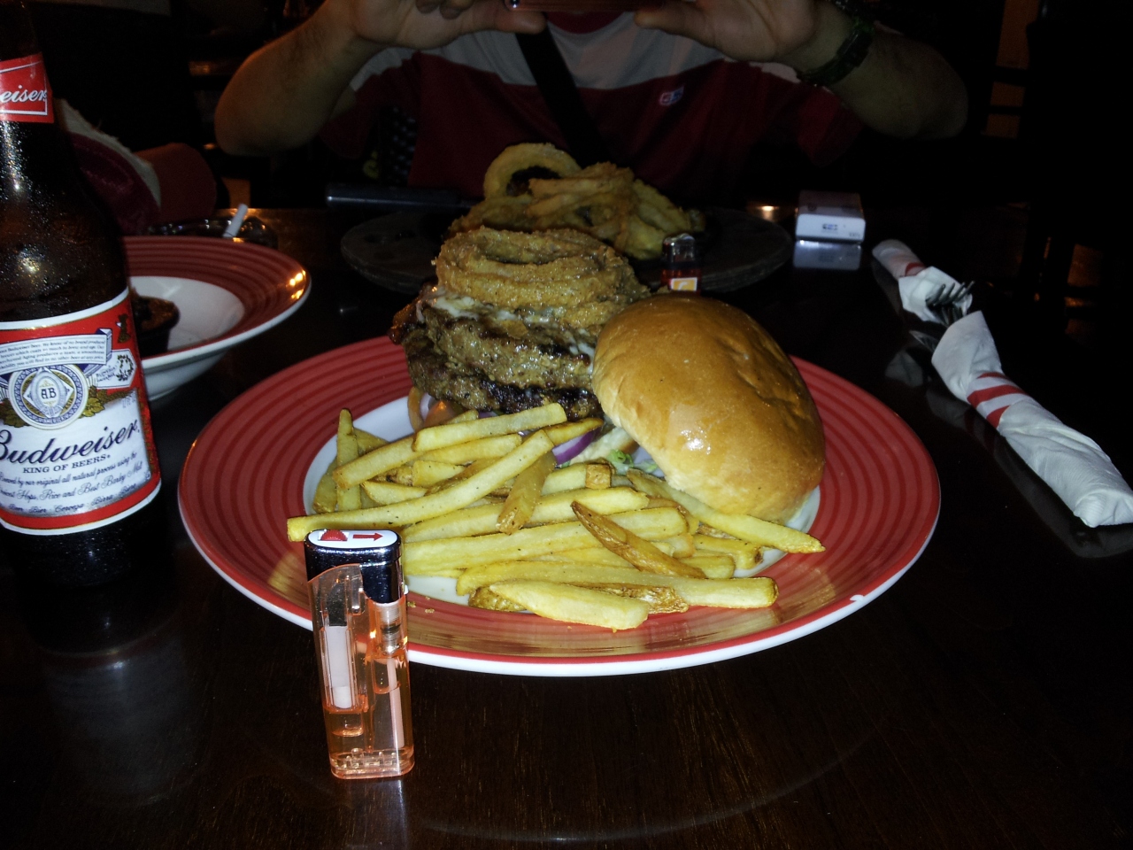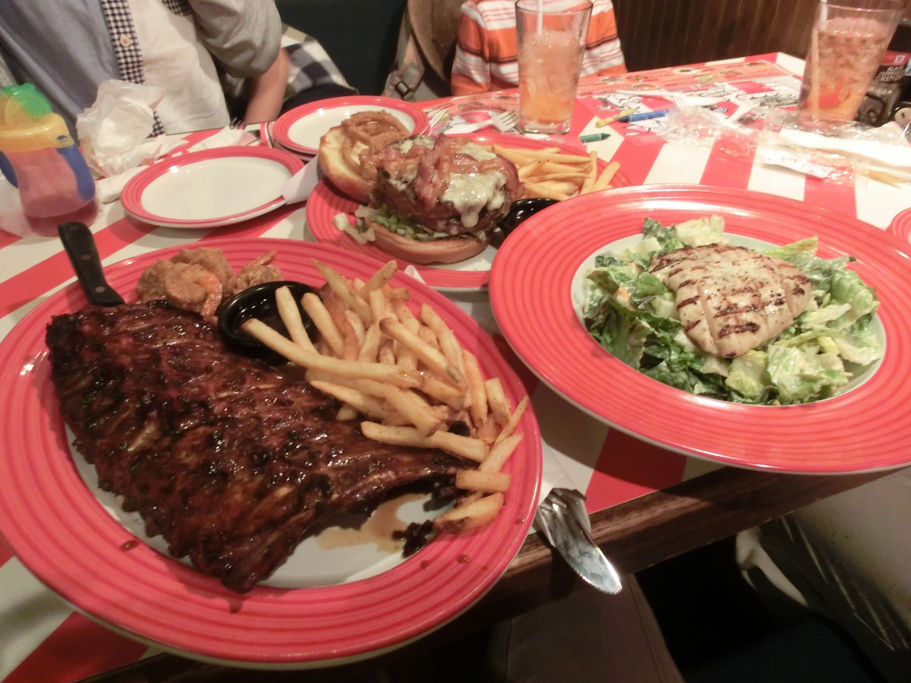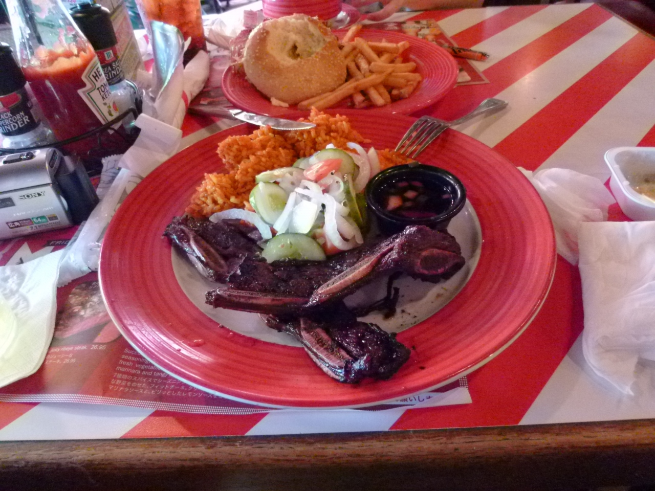 テラス席は喫煙エリアだけど ベビーカーの方もいたし ここはアメリカ ゆっくり構えて おおらかにいくといいよ とにかく混んでたから ウェイトレスさんは これお勧めってせっかくいってくれたので ハーフリブのセットとストロベリーサプライズ アイスはバニラにキャラメルソースでおいしかった 旦那はビールコロナ(BIG)とベビーパブリックリブ 迫力&おいしかったそうな コロナは迫力のビンだから 紙ナプキンで栓をしてるカップルみて 真似した(賢いと思って)外はハエブンブンだから 浮かんだらね・・・ ウェイトレスさんも忙しそうだけど MayIhaveyournameplease と聞いてgoodtasteとか あなたは素敵ねなんて繰り返せは 忙しくてもリップサービスしてくれたよ