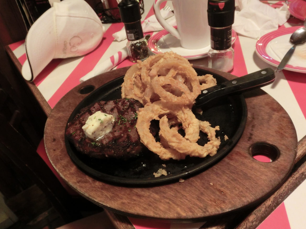 パスタ、ステーキ、オニオンスープ、ドリンク4つで