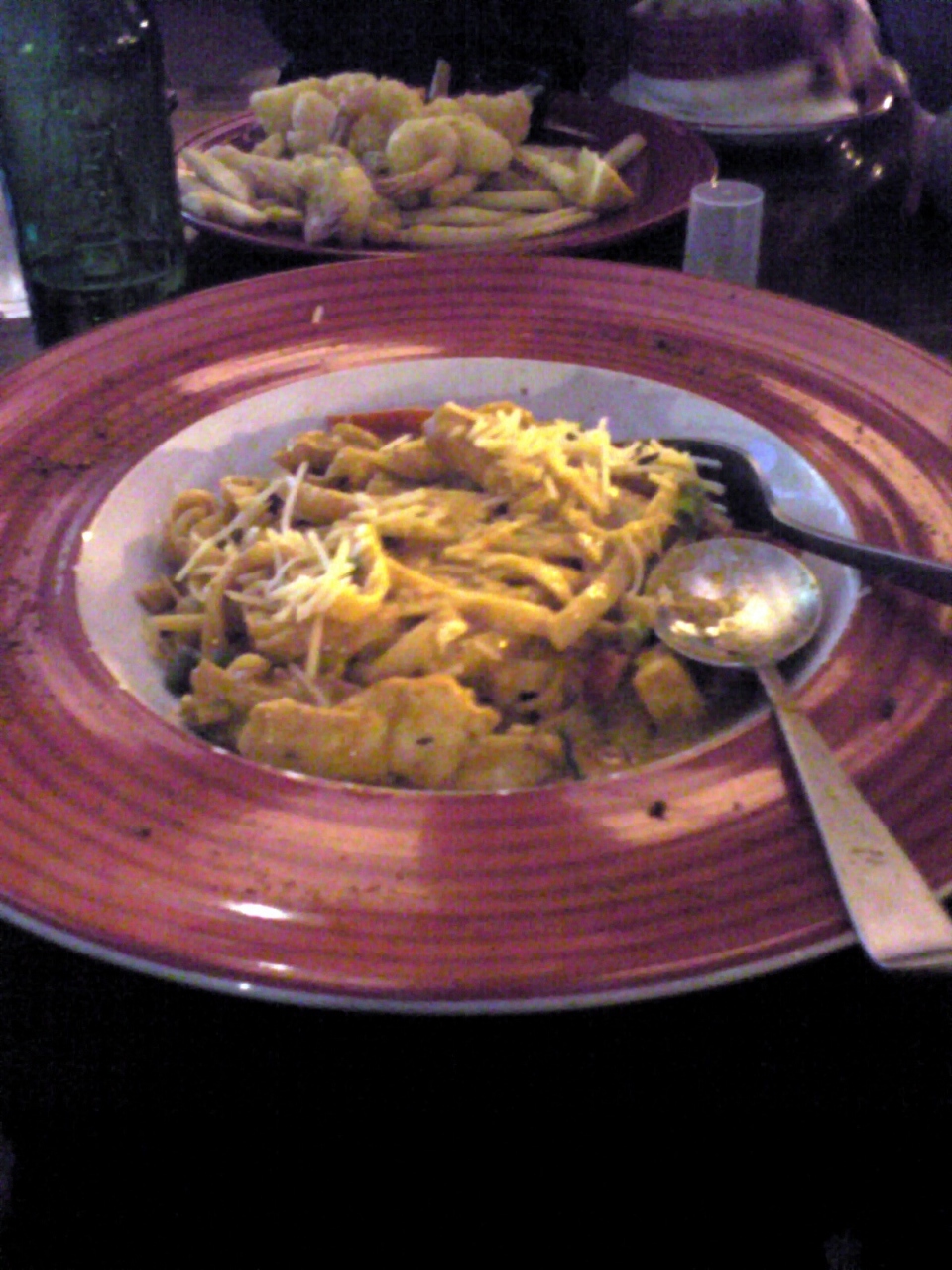 近くに座った、勧めるがままにロブスターとか載っかってる高ーいコースメニューを頼んだ後から来た3人の親子のところには頻繁に回ってくるのに(苦笑)。