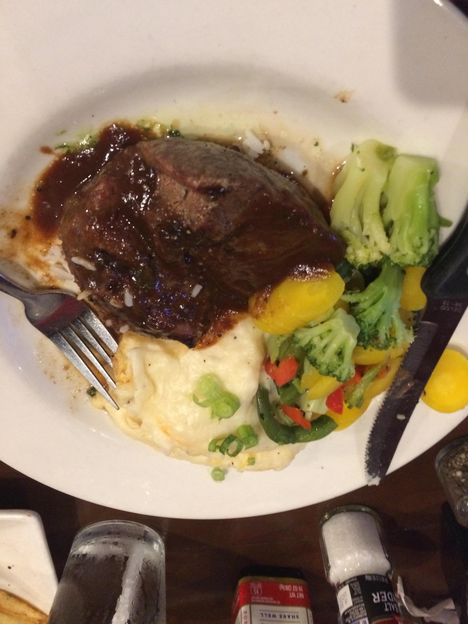 私はステーキ、妻はハンバーガーを注文。1歳半の息子にはオムライスを注文しました。ステーキは焼き加減を選べます。ただ、塩味がなく、卓上塩を振って調節する必要がありました。つけあわせが相変わらず多く、マッシュポテトとスチームライスは食べきれませんでした。