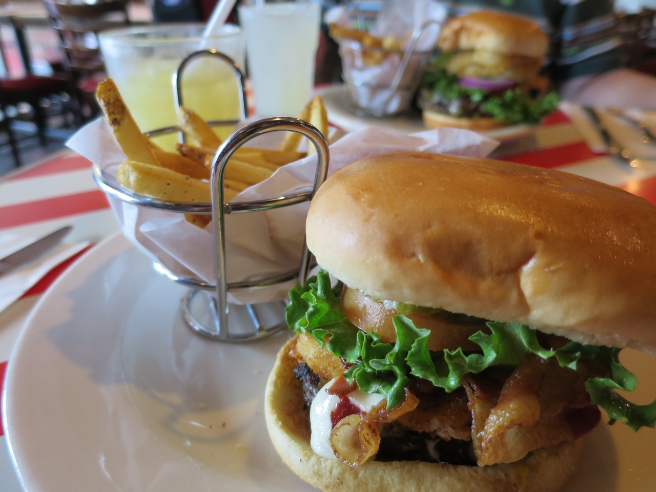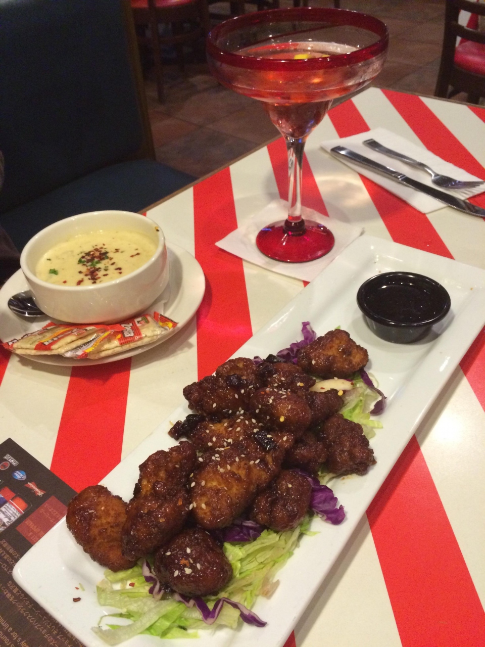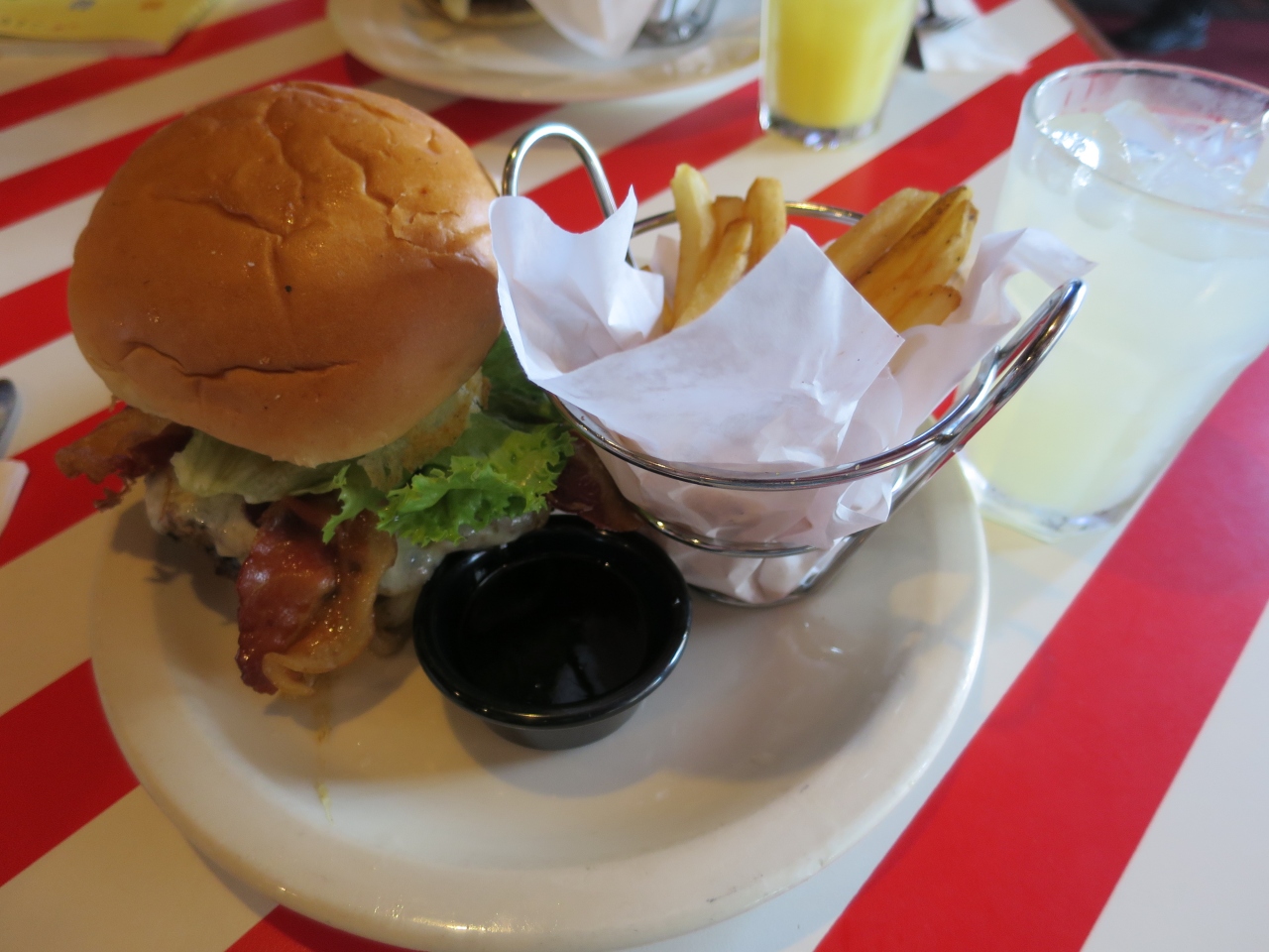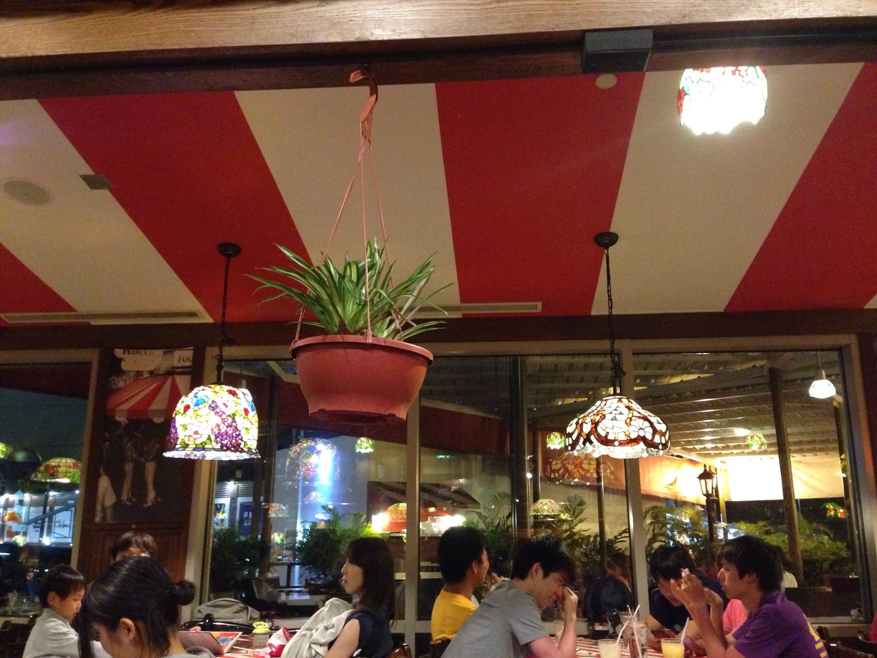 アメリカっぽさが漂うごちゃごちゃしたカラフルな内装に赤と白のストライプ柄のテーブルで、冷房はガンガンに効いており上着必須です。テラス席もあり、あまりの寒さに、テラス席に移動を希望している人も見かけました。