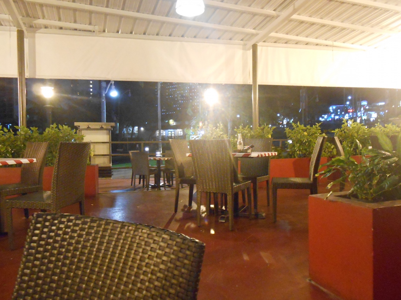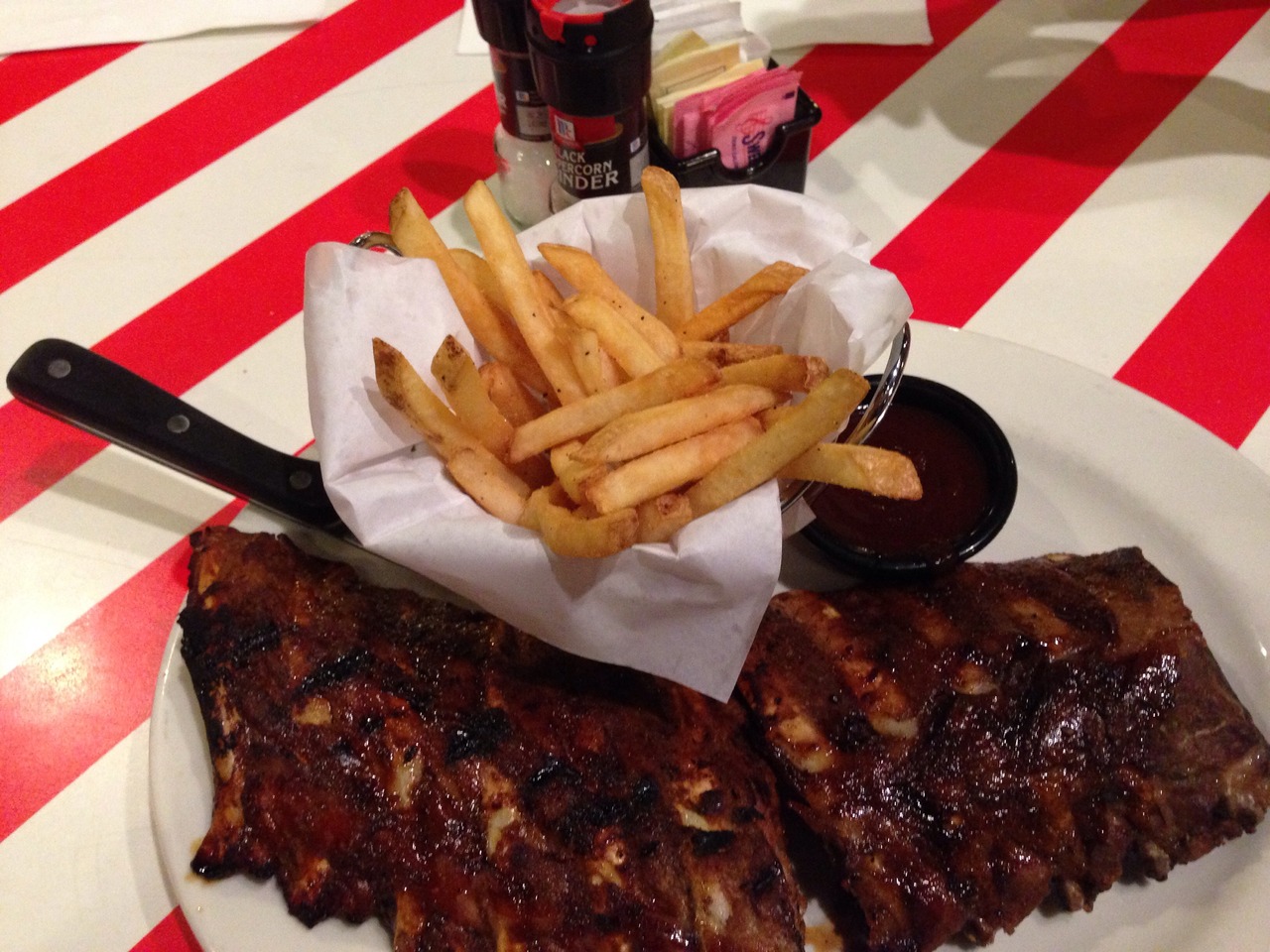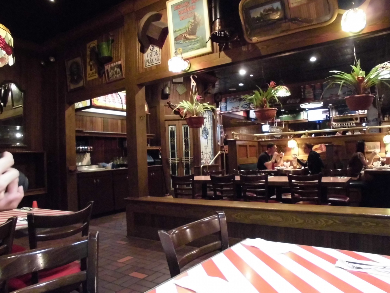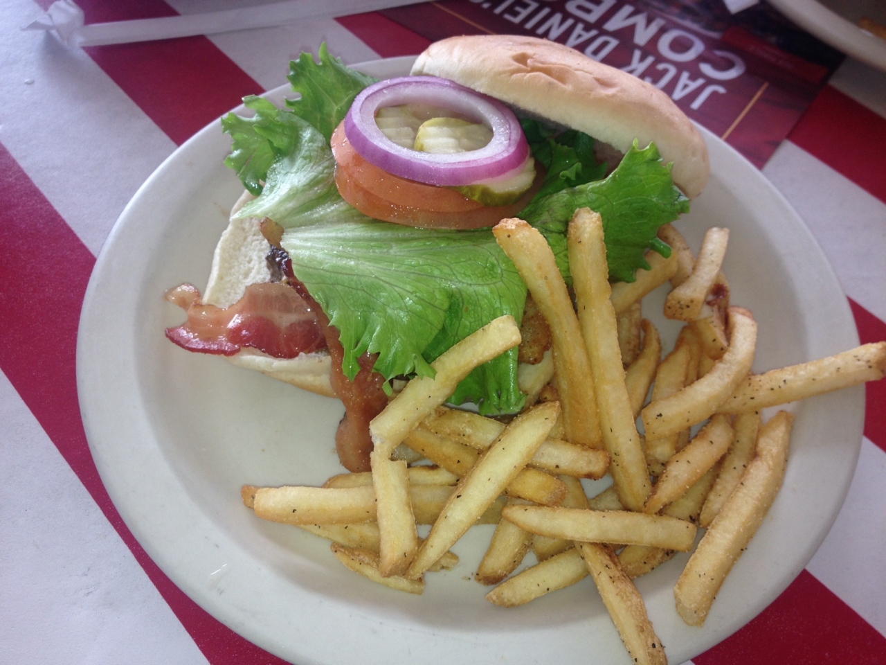 アメリカっぽさが漂うごちゃごちゃしたカラフルな内装に赤と白のストライプ柄のテーブルで、冷房はガンガンに効いており上着必須です。テラス席もあり、あまりの寒さに、テラス席に移動を希望している人も見かけました。