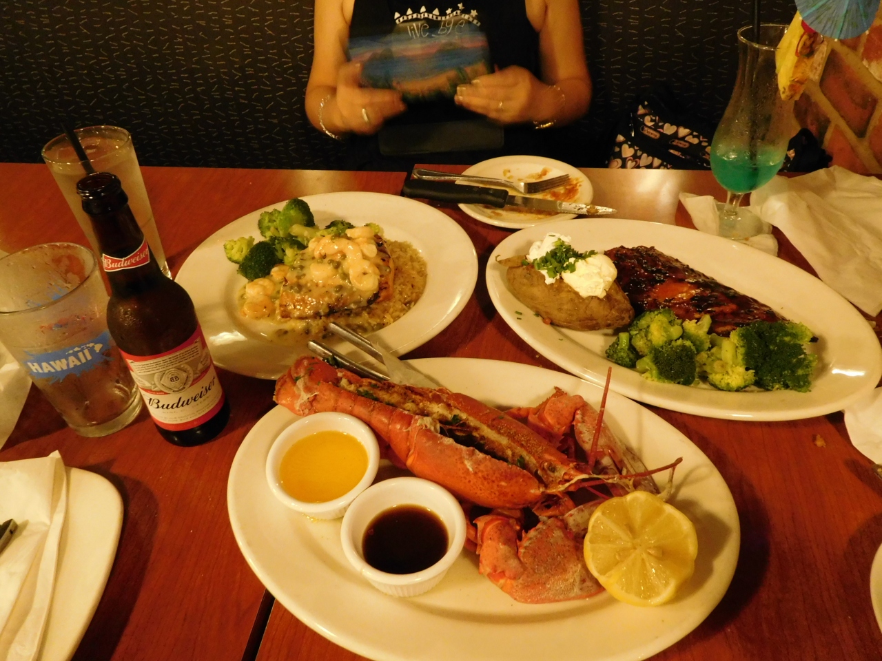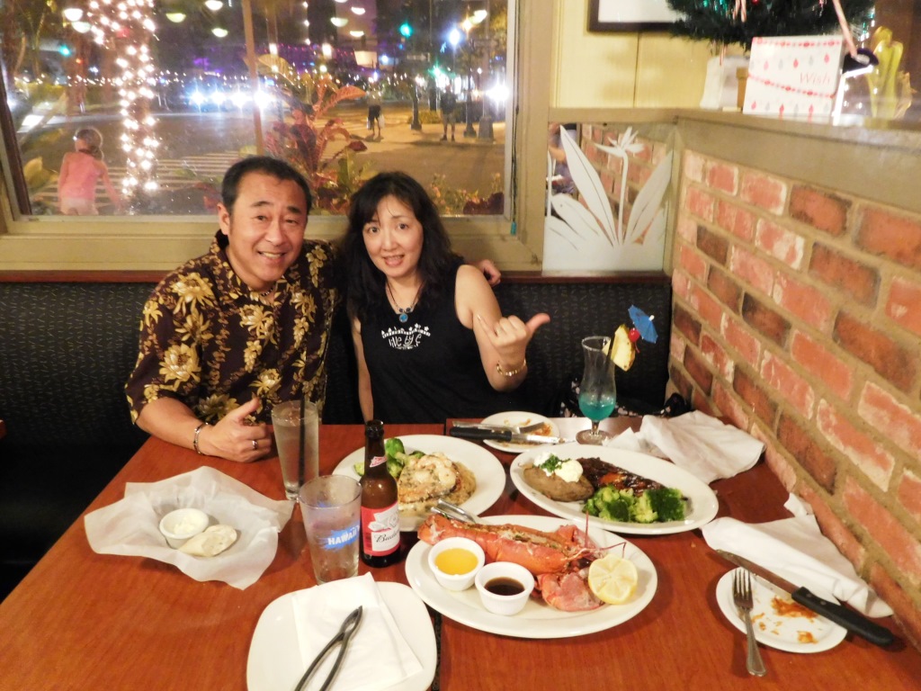 私達はこの時、一人前が49ドルのセット料理をオーダーしたのだが、BBQリブにシュリンプ&サーモングリルに、ビッグサイズのロブスターという内容で、ワイキキでは超格安の料金設定だと感心したくらいである。もちろん、ドリンク類は別料金だが、タウン誌に付いているクーポンを提示すれば、オニオンローフが無料で貰えるというサービスもあり、お得感満載だった。ちなみに、郷土の青森店では、毎年の誕生日にトニーローマで食事しているが、スタッフのハッピーバースディコールに囲まれて、スペシャルスィーツのプレートもプレゼントされるので、そういった催しはアメリカの店でも同様に提供されるはずである。