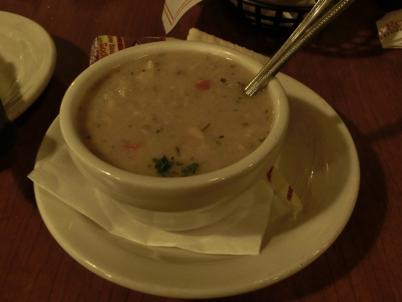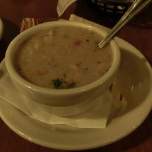 オーダーは大好きなオニオンスープと店員さんおススメの本日のスープ「スパイシークラムチャウダー」とミディアムサイズのリブ。