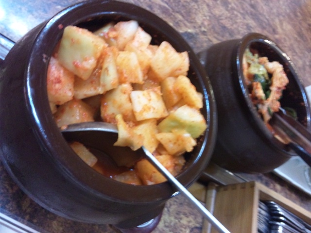 昼前の時間帯で、待たずに奥の座敷へ案内され、壺入りのカクテキをつまみにビールを飲んで待っていると、10分位でグラグラ泡を立てた参鶏湯が登場!