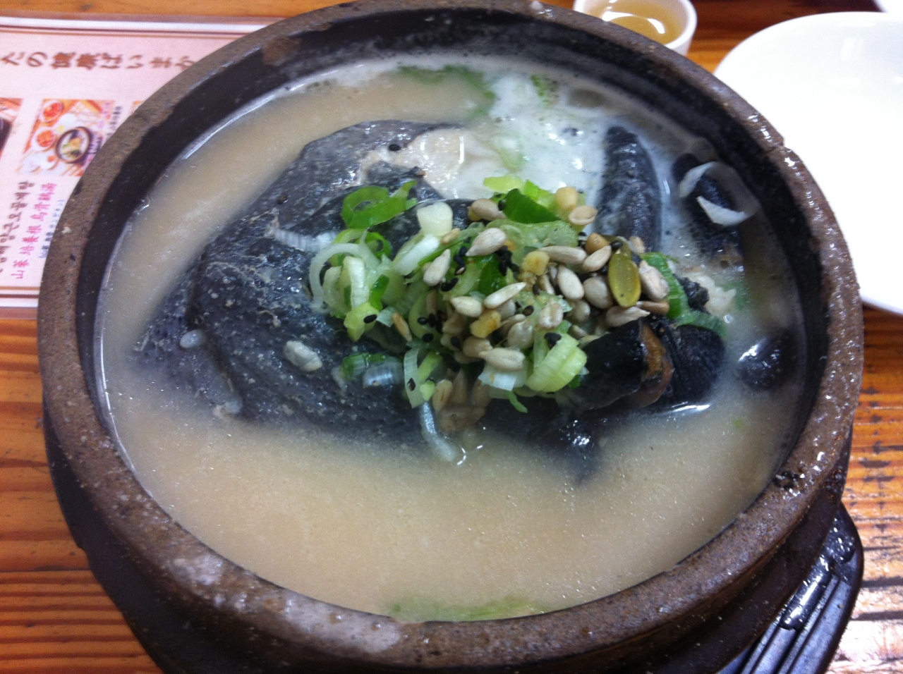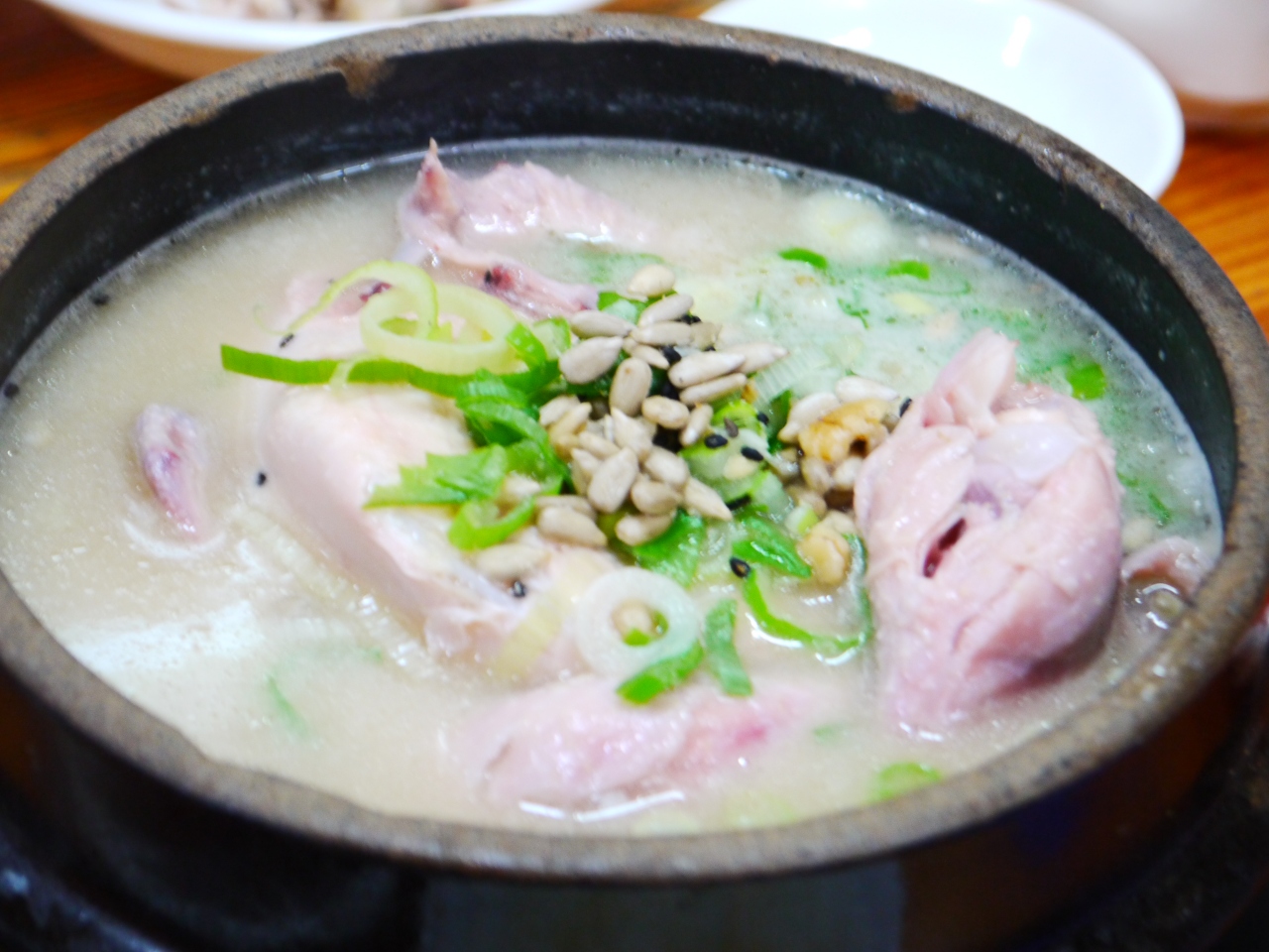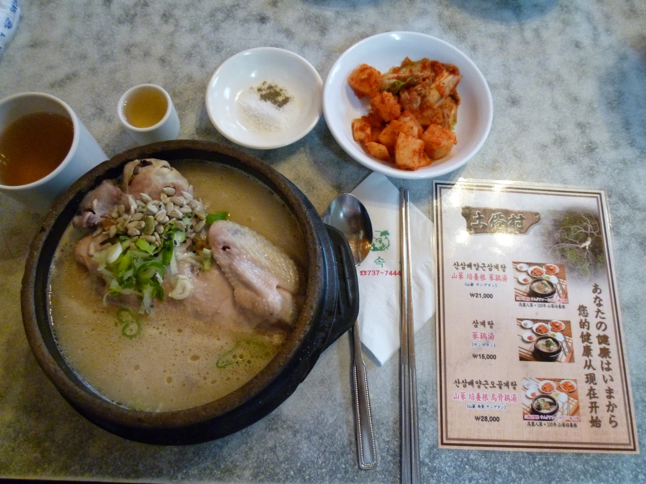 店内は皆さん参鶏湯を食べています。渡されるメニューには普通の参鶏湯と烏骨鶏の参鶏湯くらいしか載っていませんが、鳥の丸焼きとかチヂミもオーダー可能ですので是非食べてください。私は以前も来たことはありますが、一人で一人前の参鶏湯を食べるほど煮た鶏肉はすきではないので、鳥の丸焼きとかチヂミをシェアして食べる方が好みです。こちらの海鮮チヂミは私の今まで食べたチヂミの中で1、2を争うお味です。 閉じる投稿日:2013/12/30