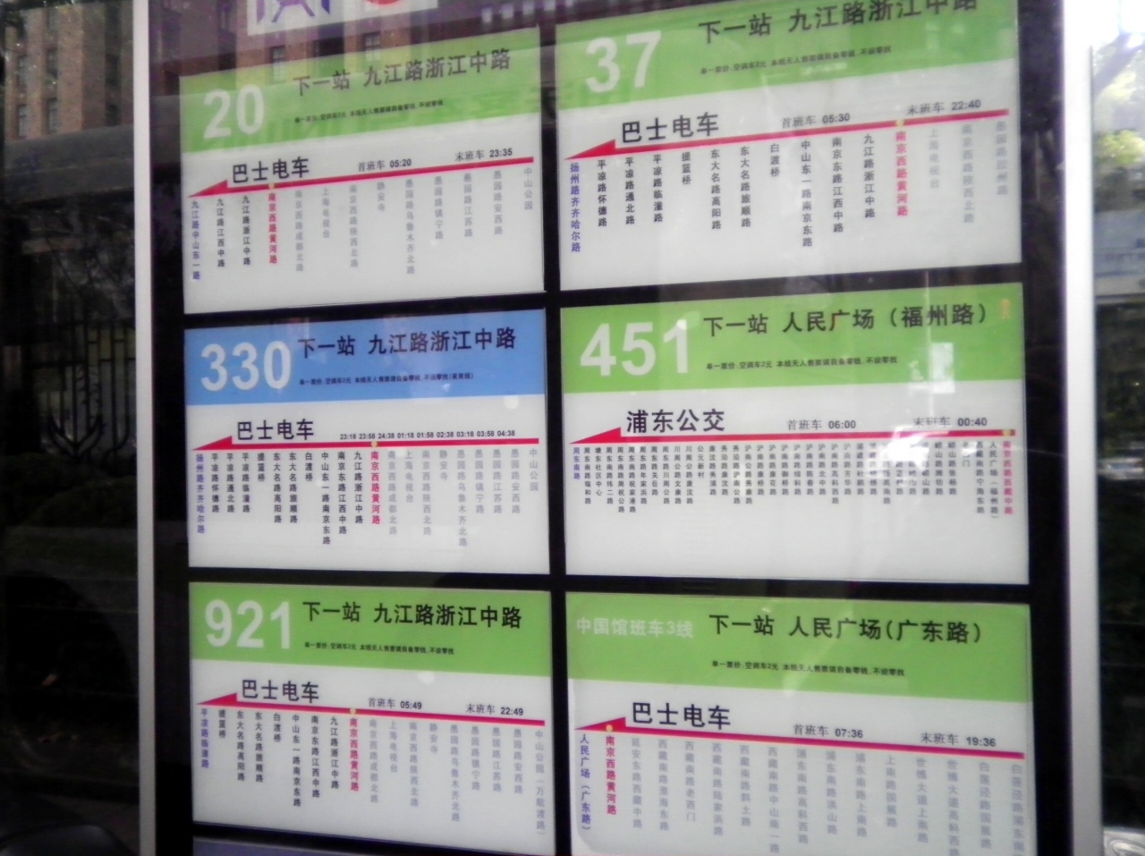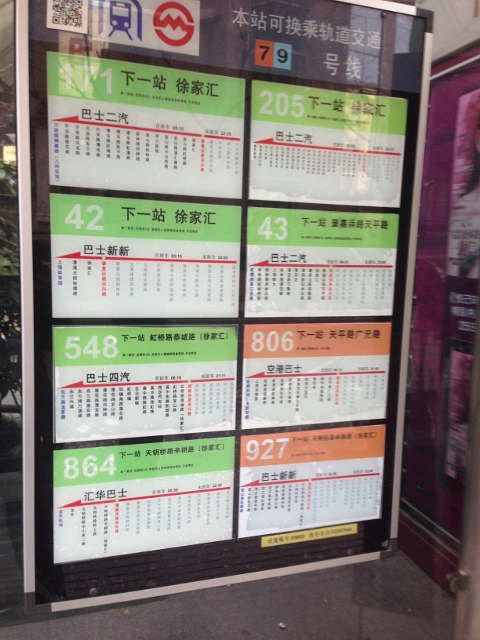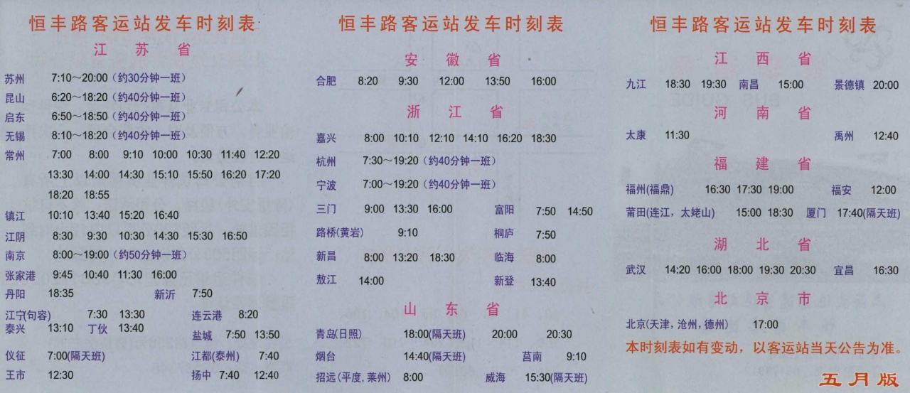 上海の主要なバスターミナルの一つ恒豊路客運站の時刻表.今年6月のものです。